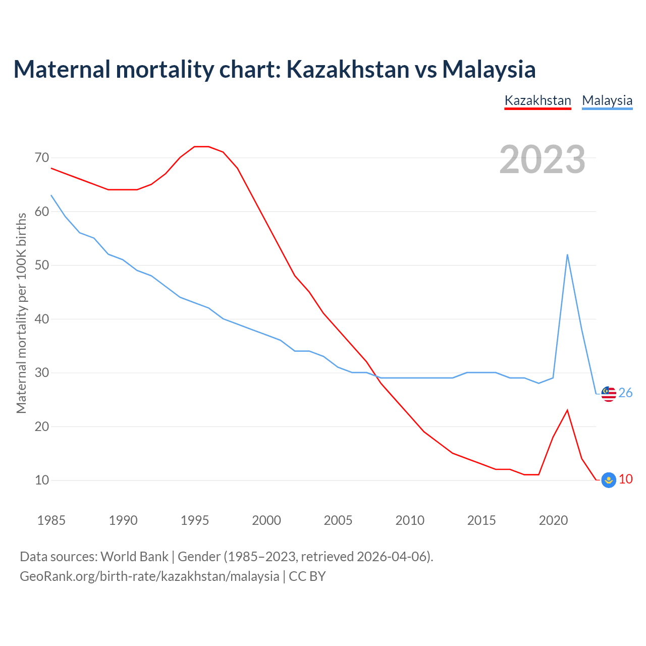 The maternal mortality rate, which is the probability of dying during childbirth or within 42 days of pregnancy termination, is 10 deaths per 100,000 live births in Kazakhstan, compared to 26 deaths in Malaysia.