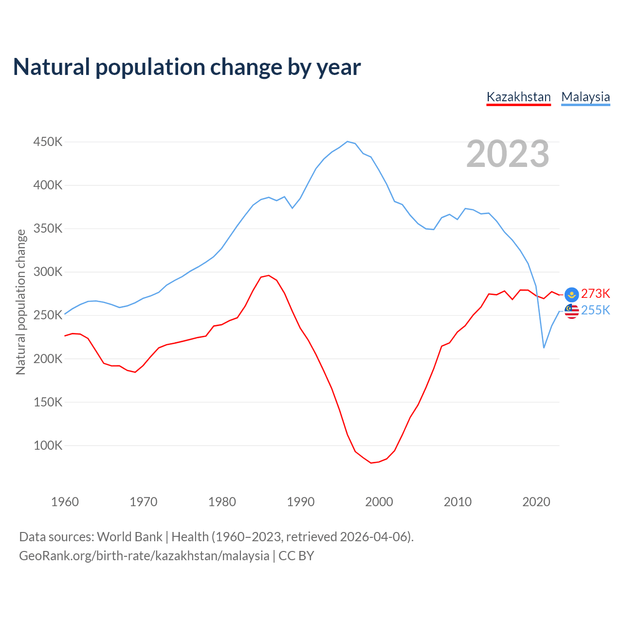 According to the latest available data on birth rates, the fertility rate in Kazakhstan was 3.01 children per woman in 2023, compared to 1.55 in Malaysia in 2023. The replacement level is considered to be 2.1 children per woman.