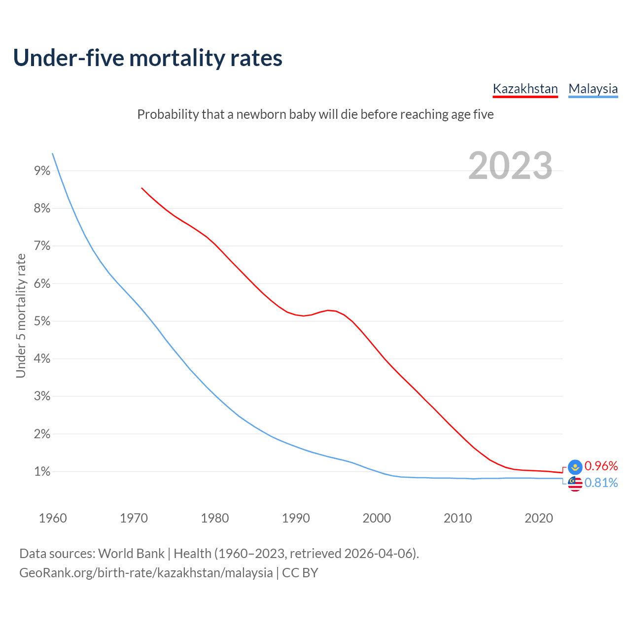 The chance that a newborn baby will die before reaching age five is 0.96% in Kazakhstan and 0.81% in Malaysia. Above is a chart with historical data on under-five mortality rates.
