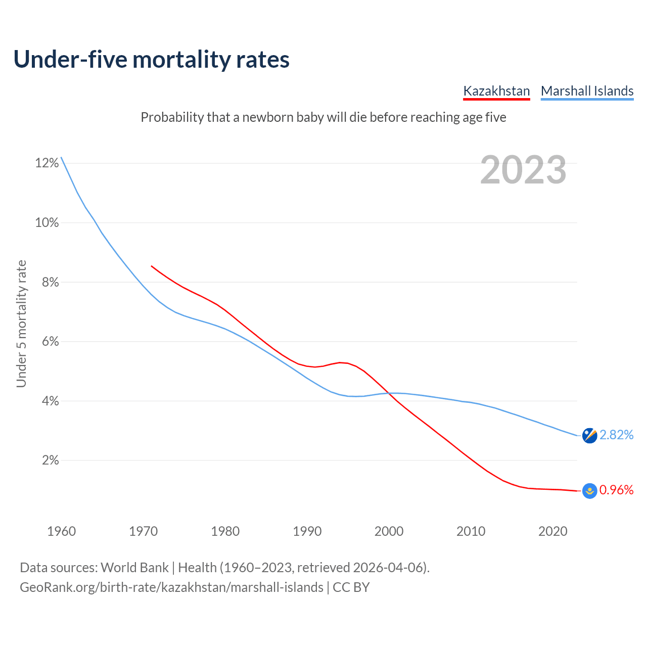 The chance that a newborn baby will die before reaching age five is 0.96% in Kazakhstan and 2.82% in the Marshall Islands. Above is a chart with historical data on under-five mortality rates.