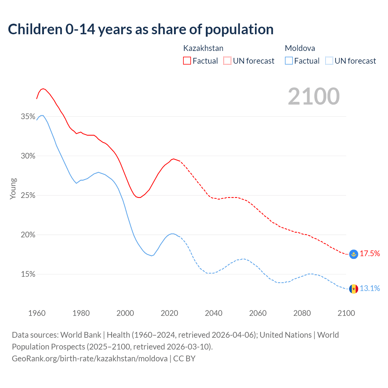 Kazakhstan has an annual birth rate of 20.1 births per 1,000 people, compared to 10.8 for Moldova. The average number of children a woman is expected to have during her lifetime — the fertility rate, is 3.01 in Kazakhstan and 1.73 in Moldova — 42.5% difference.