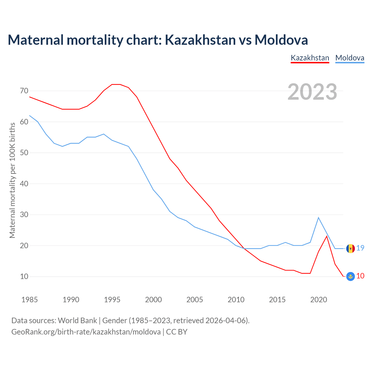 - Annual births per 1,000 women ages 15-19 (adolescent birth rate or teenage mother rate) is 18.2 in Kazakhstan vs 23 in Moldova.