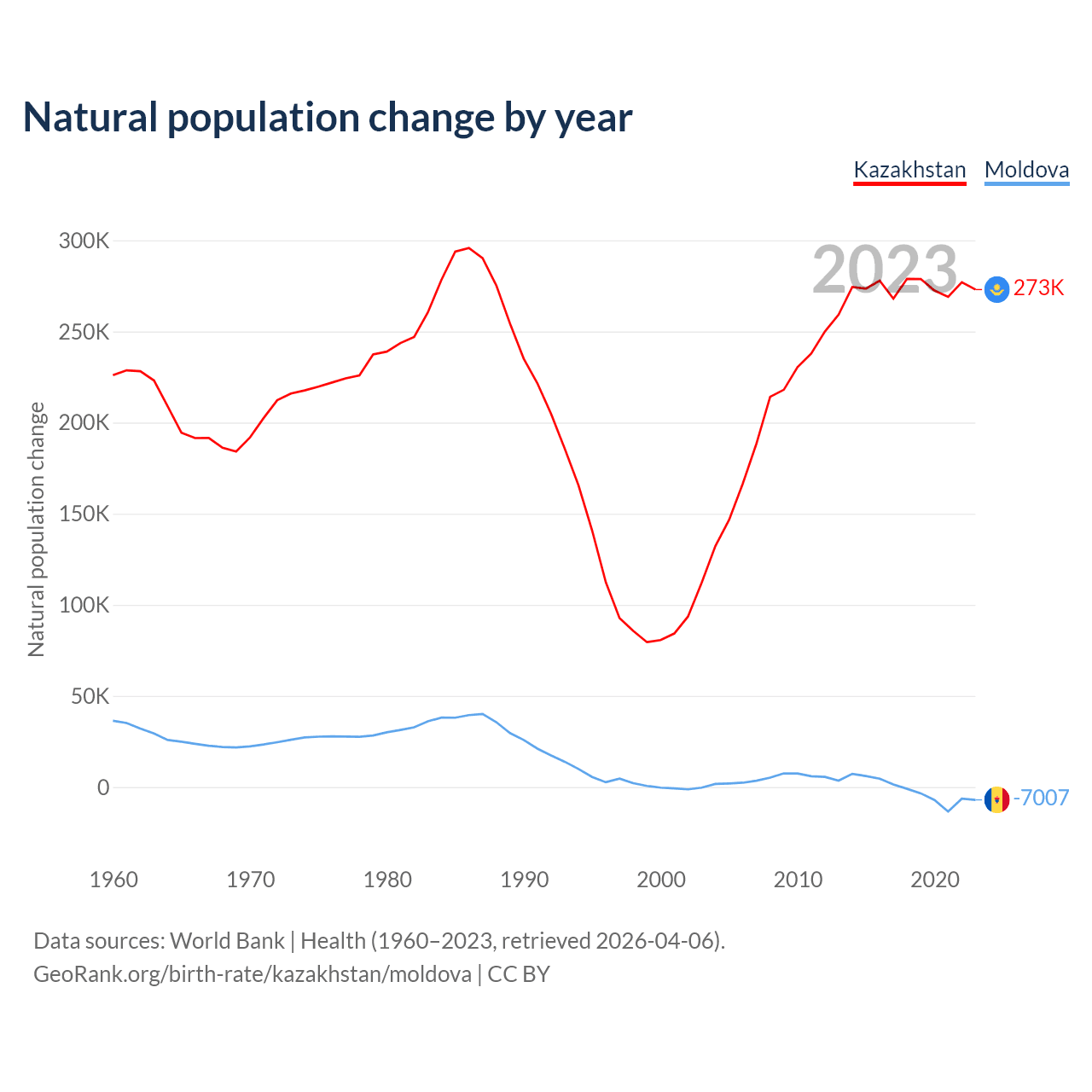 According to the latest available data on birth rates, the fertility rate in Kazakhstan was 3.01 children per woman in 2023, compared to 1.73 in Moldova in 2023. The replacement level is considered to be 2.1 children per woman.