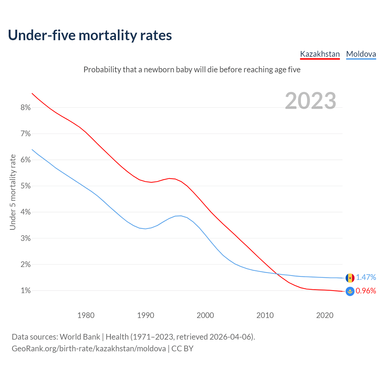 The chance that a newborn baby will die before reaching age five is 0.96% in Kazakhstan and 1.47% in Moldova. Above is a chart with historical data on under-five mortality rates.