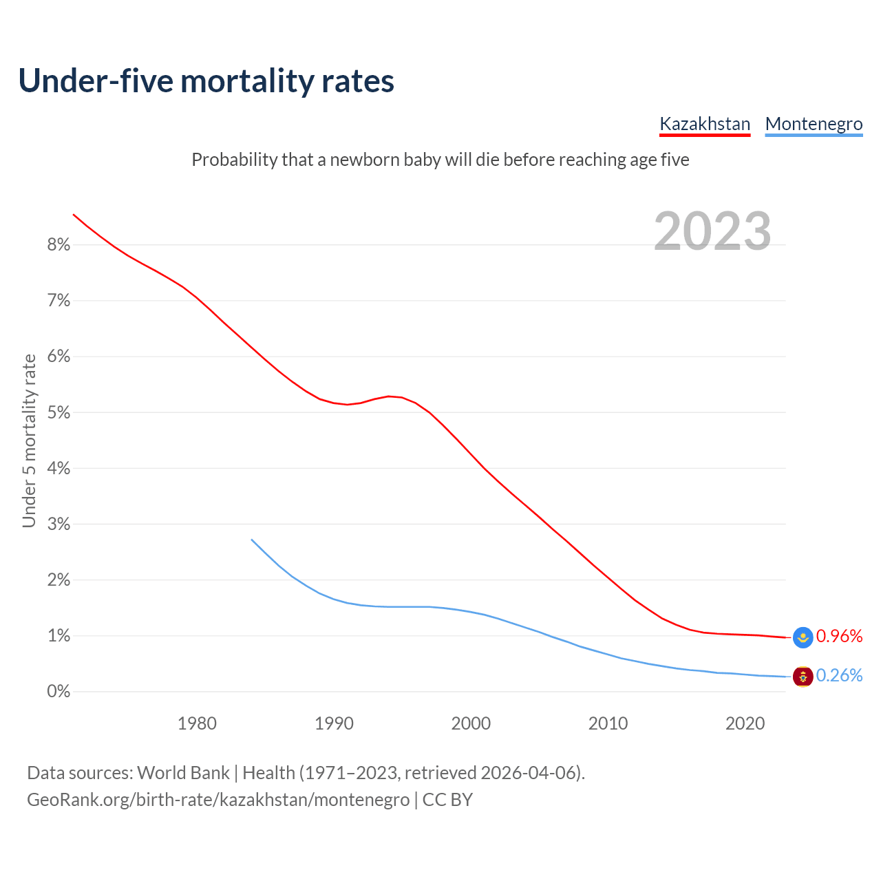 The chance that a newborn baby will die before reaching age five is 0.96% in Kazakhstan and 0.26% in Montenegro. Above is a chart with historical data on under-five mortality rates.