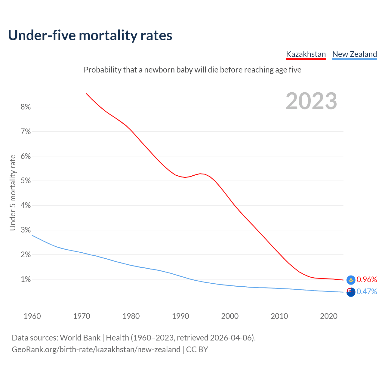 The chance that a newborn baby will die before reaching age five is 0.96% in Kazakhstan and 0.47% in New Zealand. Above is a chart with historical data on under-five mortality rates.