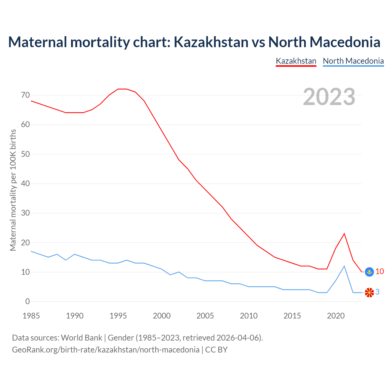 The maternal mortality rate, which is the probability of dying during childbirth or within 42 days of pregnancy termination, is 10 deaths per 100,000 live births in Kazakhstan, compared to 3 deaths in North Macedonia.