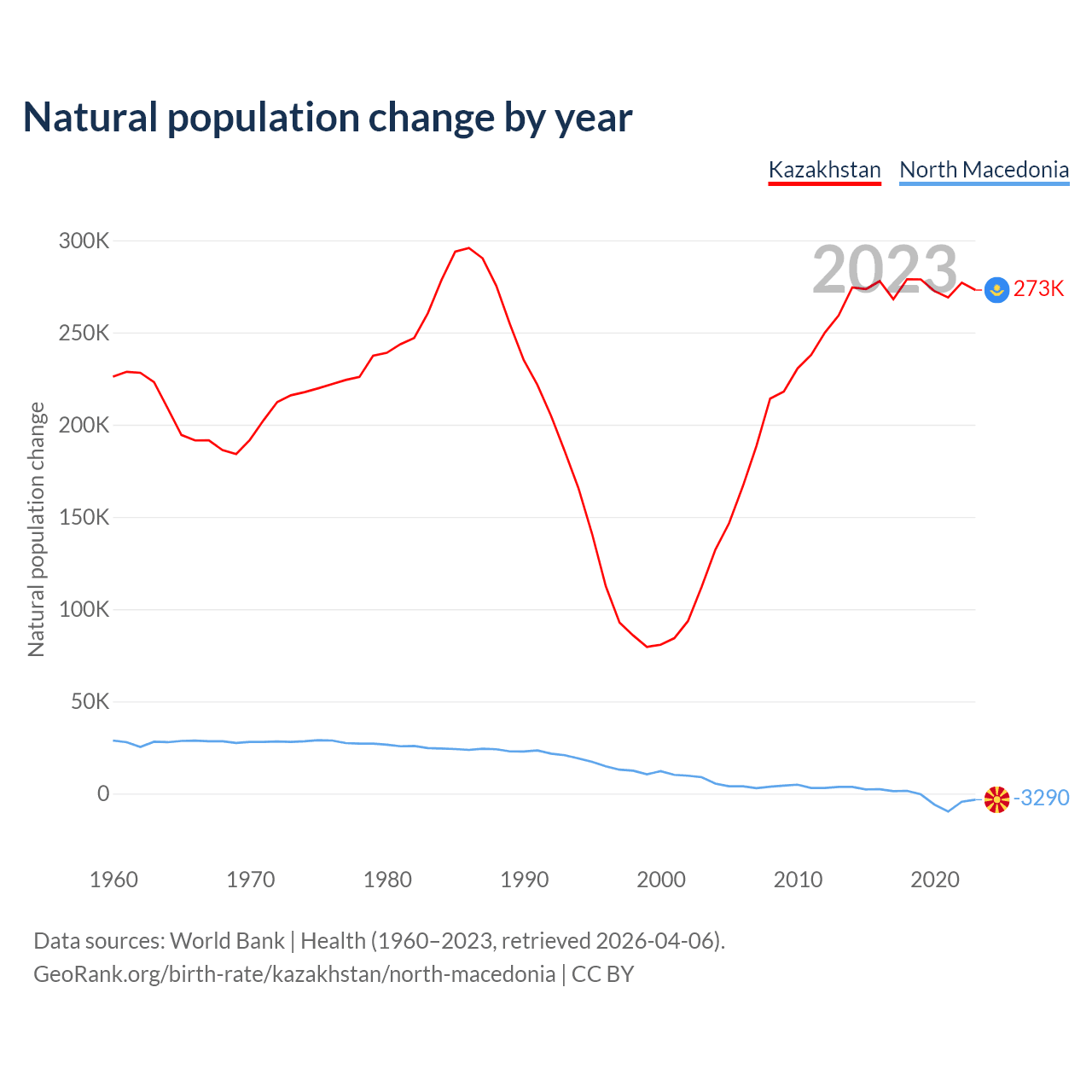 According to the latest available data on birth rates, the fertility rate in Kazakhstan was 3.01 children per woman in 2023, compared to 1.5 in North Macedonia in 2023. The replacement level is considered to be 2.1 children per woman.