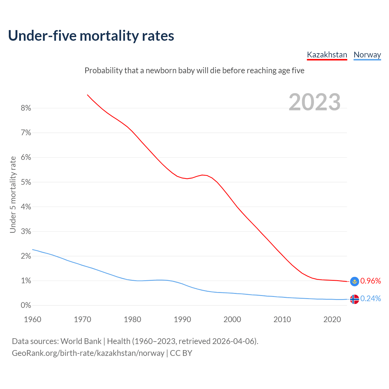 The chance that a newborn baby will die before reaching age five is 0.96% in Kazakhstan and 0.24% in Norway. Above is a chart with historical data on under-five mortality rates.