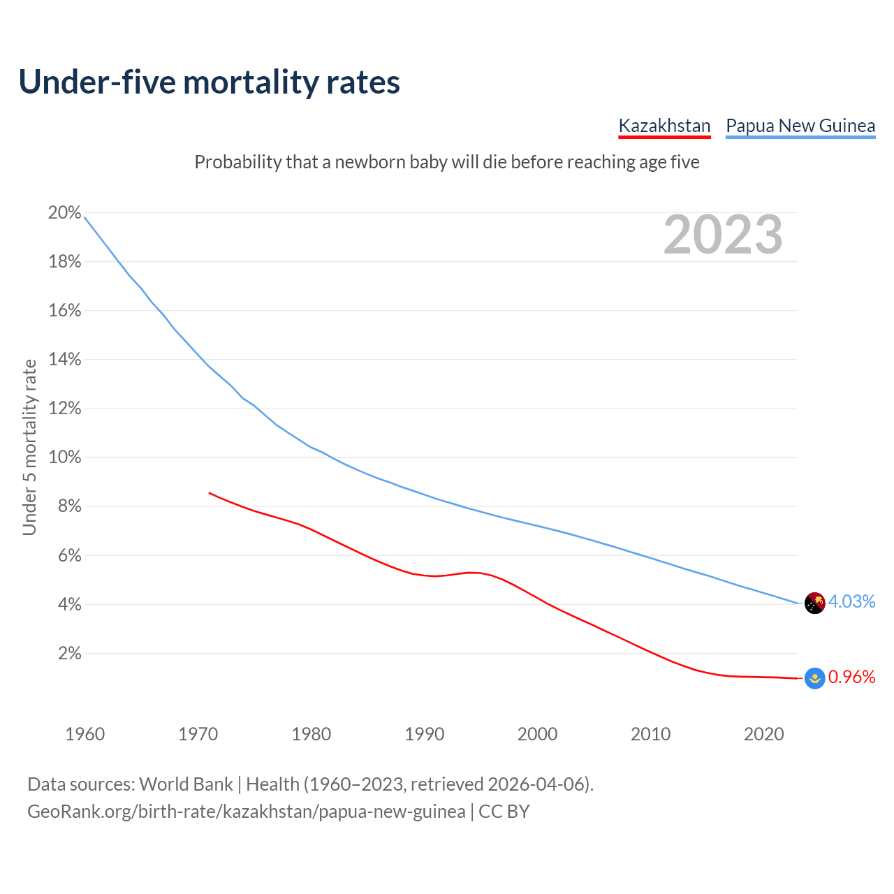 The chance that a newborn baby will die before reaching age five is 0.96% in Kazakhstan and 4.03% in Papua New Guinea. Above is a chart with historical data on under-five mortality rates.