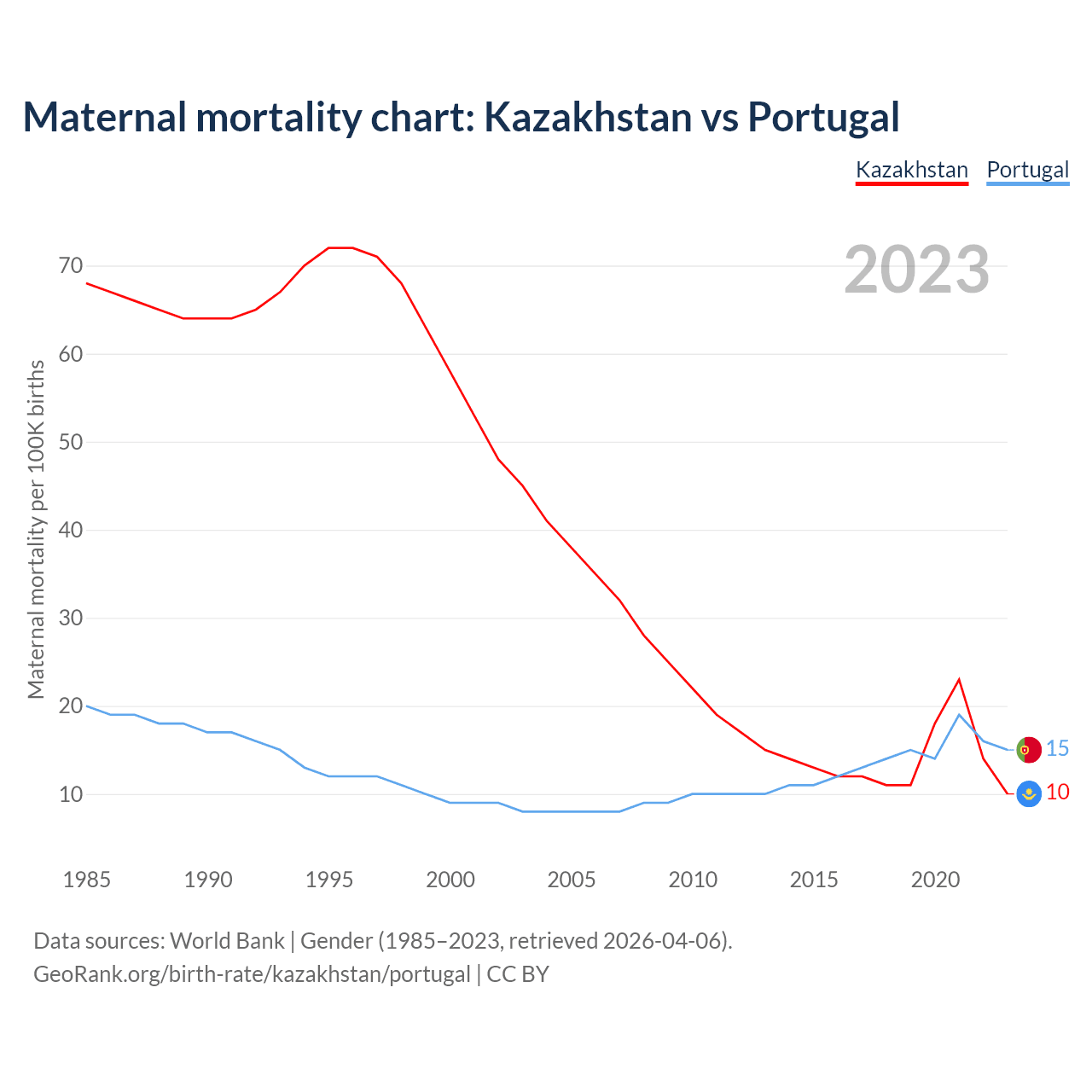 The maternal mortality rate, which is the probability of dying during childbirth or within 42 days of pregnancy termination, is 10 deaths per 100,000 live births in Kazakhstan, compared to 15 deaths in Portugal.