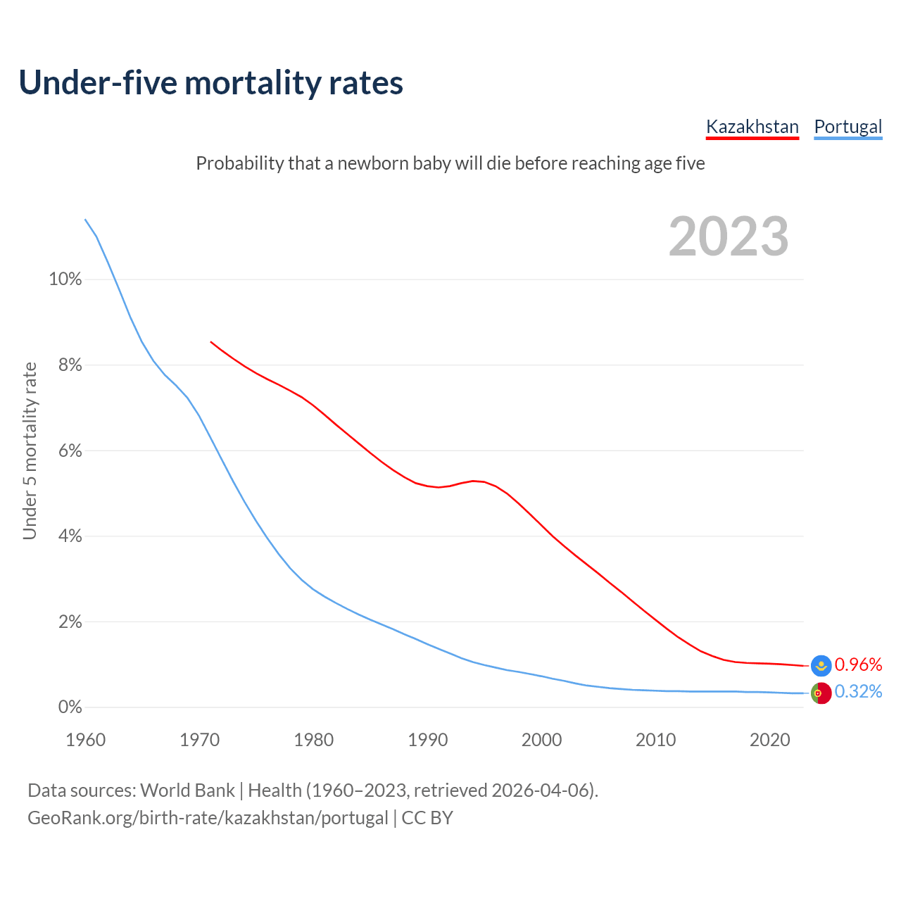 The chance that a newborn baby will die before reaching age five is 0.96% in Kazakhstan and 0.32% in Portugal. Above is a chart with historical data on under-five mortality rates.