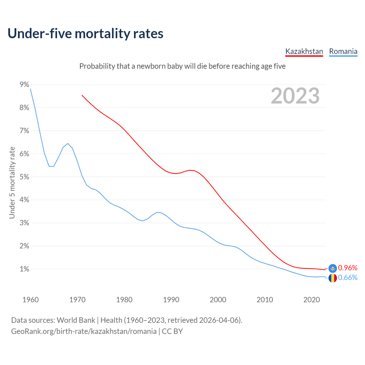The chance that a newborn baby will die before reaching age five is 0.96% in Kazakhstan and 0.66% in Romania. Above is a chart with historical data on under-five mortality rates.