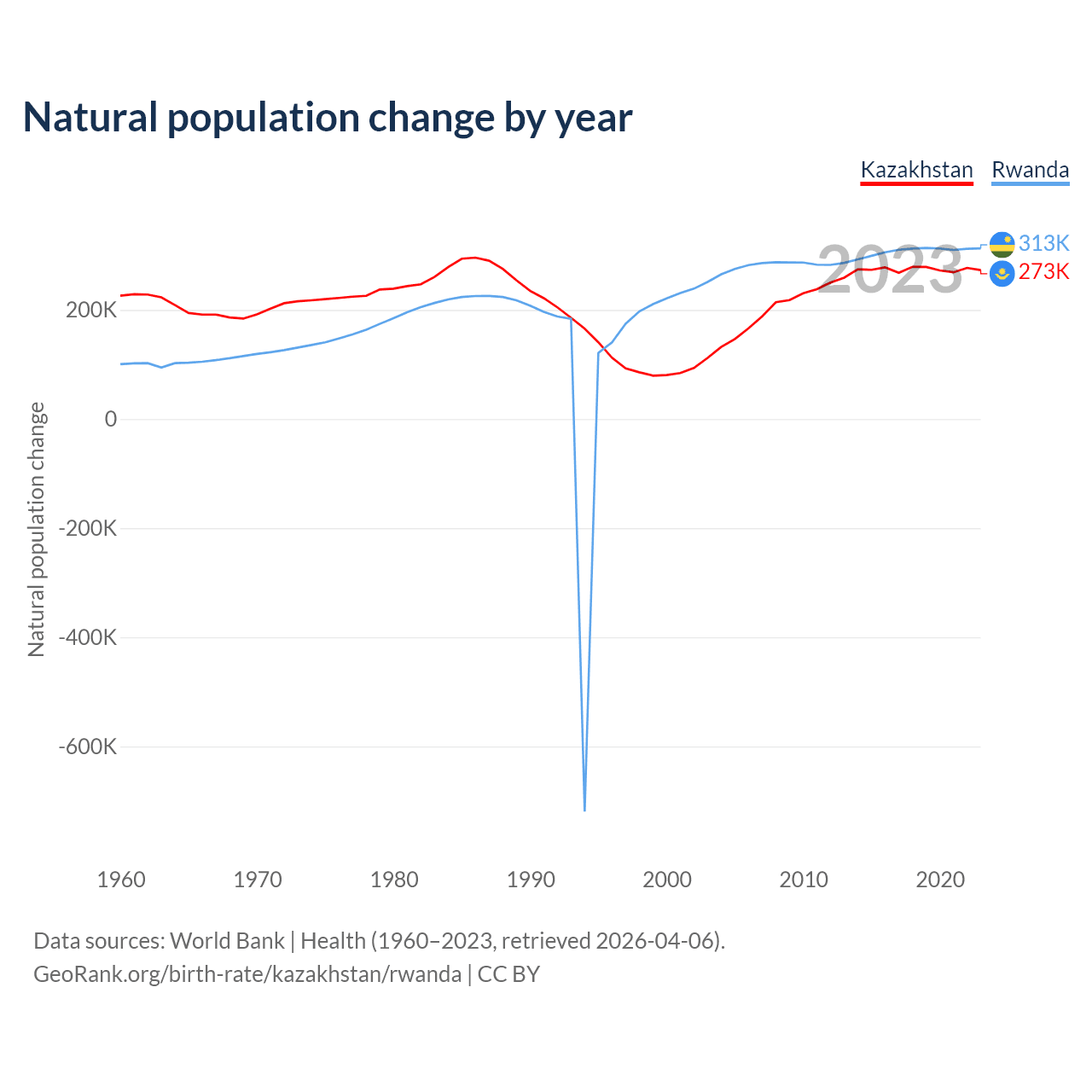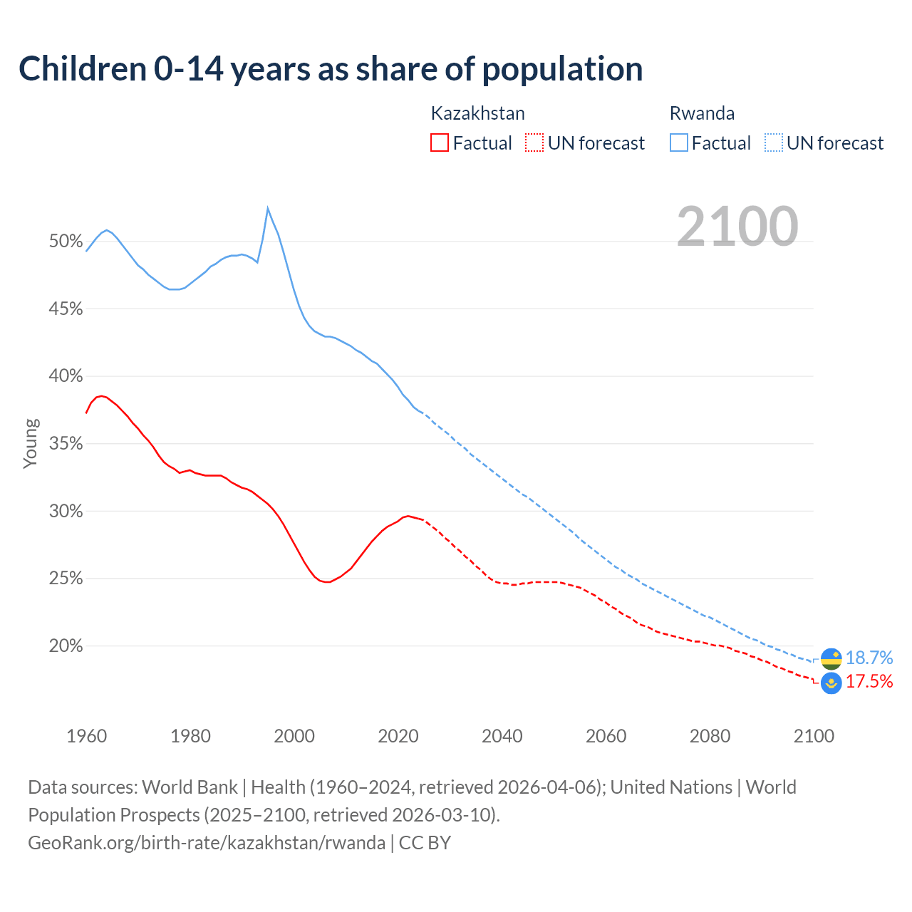 Kazakhstan has an annual birth rate of 20.1 births per 1,000 people, compared to 28.3 for Rwanda. The average number of children a woman is expected to have during her lifetime — the fertility rate, is 3.01 in Kazakhstan and 3.7 in Rwanda — 22.8% difference.