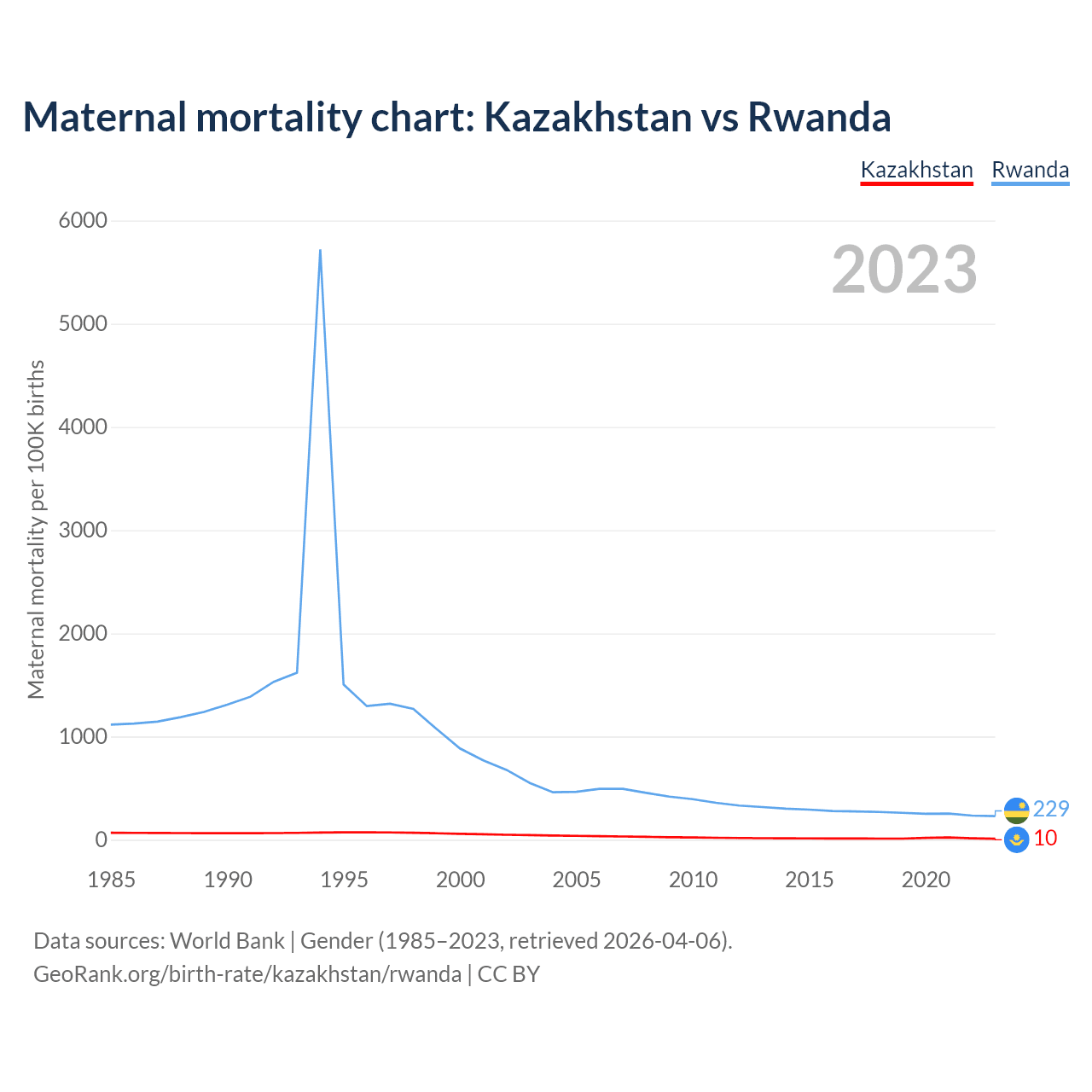 The maternal mortality rate, which is the probability of dying during childbirth or within 42 days of pregnancy termination, is 10 deaths per 100,000 live births in Kazakhstan, compared to 229 deaths in Rwanda.