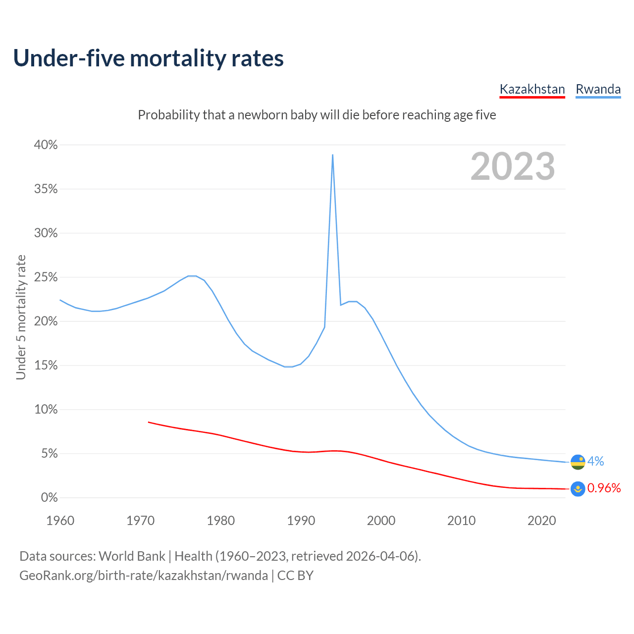 The chance that a newborn baby will die before reaching age five is 0.96% in Kazakhstan and 4% in Rwanda. Above is a chart with historical data on under-five mortality rates.