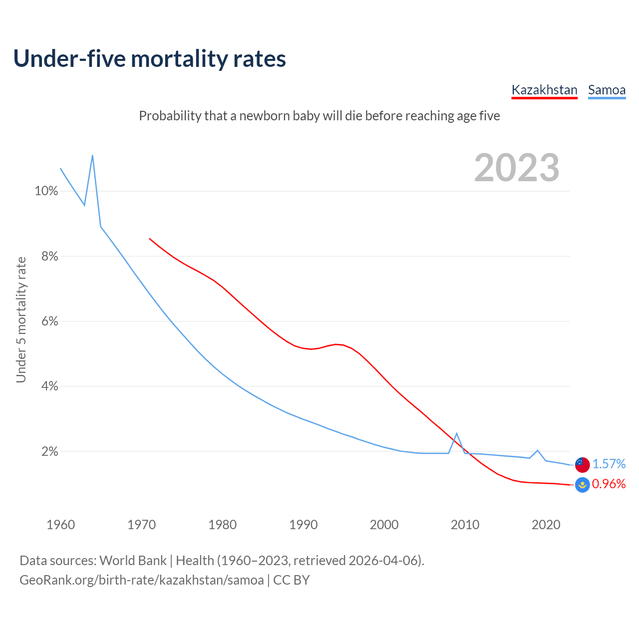 The chance that a newborn baby will die before reaching age five is 0.96% in Kazakhstan and 1.57% in Samoa. Above is a chart with historical data on under-five mortality rates.
