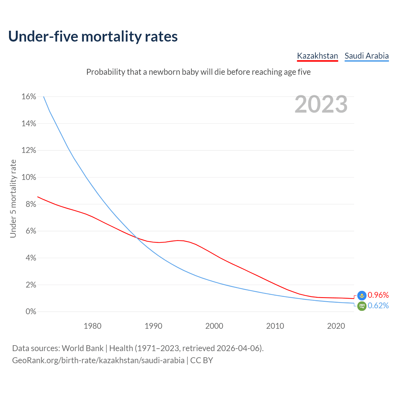The chance that a newborn baby will die before reaching age five is 0.96% in Kazakhstan and 0.62% in Saudi Arabia. Above is a chart with historical data on under-five mortality rates.