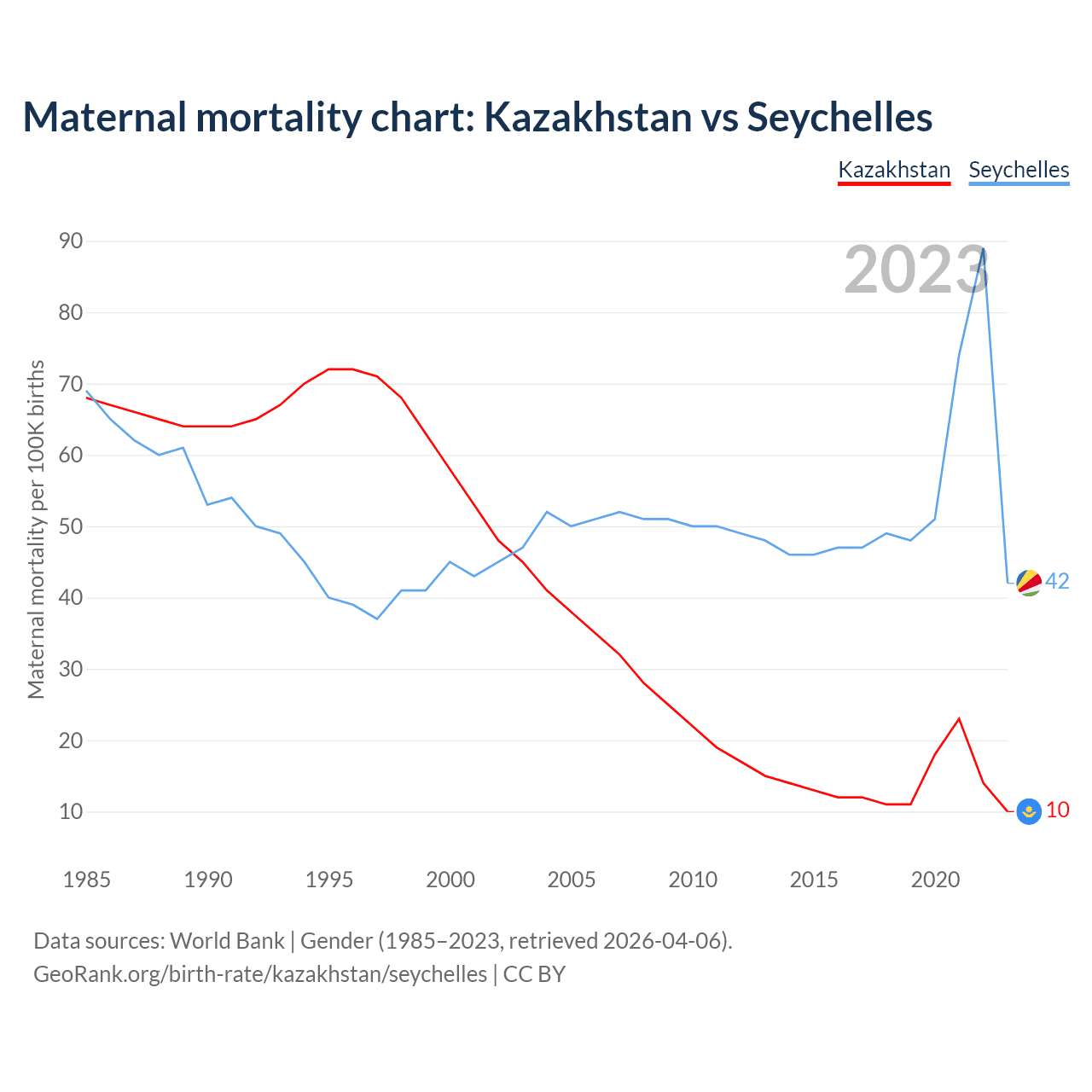 The maternal mortality rate, which is the probability of dying during childbirth or within 42 days of pregnancy termination, is 10 deaths per 100,000 live births in Kazakhstan, compared to 42 deaths in the Seychelles.