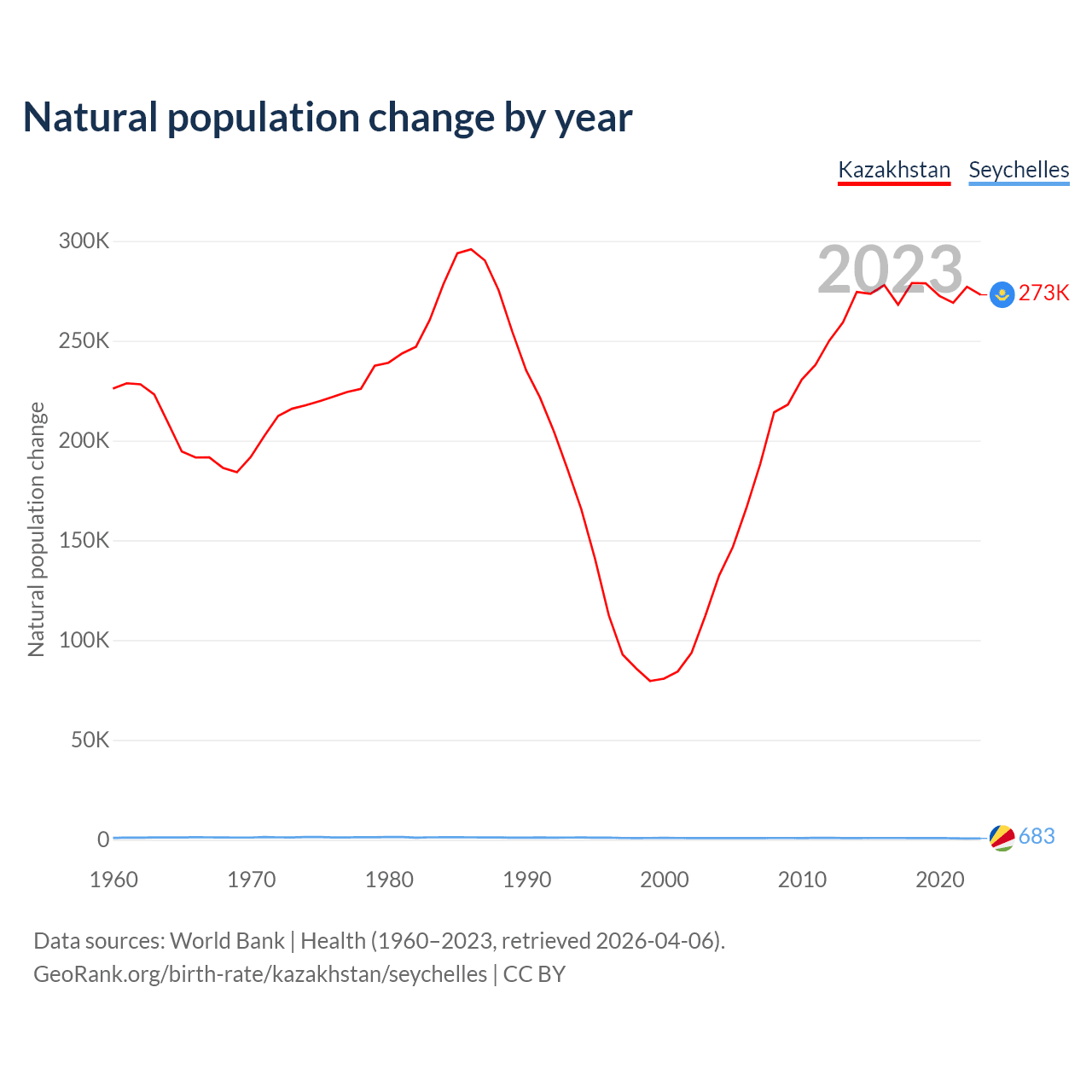According to the latest available data on birth rates, the fertility rate in Kazakhstan was 3.01 children per woman in 2023, compared to 2.02 in the Seychelles in 2023. The replacement level is considered to be 2.1 children per woman.
