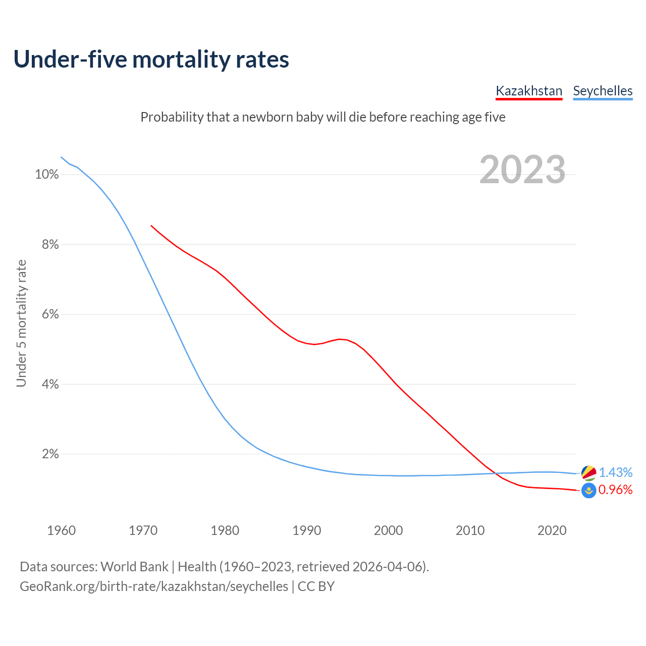 The chance that a newborn baby will die before reaching age five is 0.96% in Kazakhstan and 1.43% in the Seychelles. Above is a chart with historical data on under-five mortality rates.