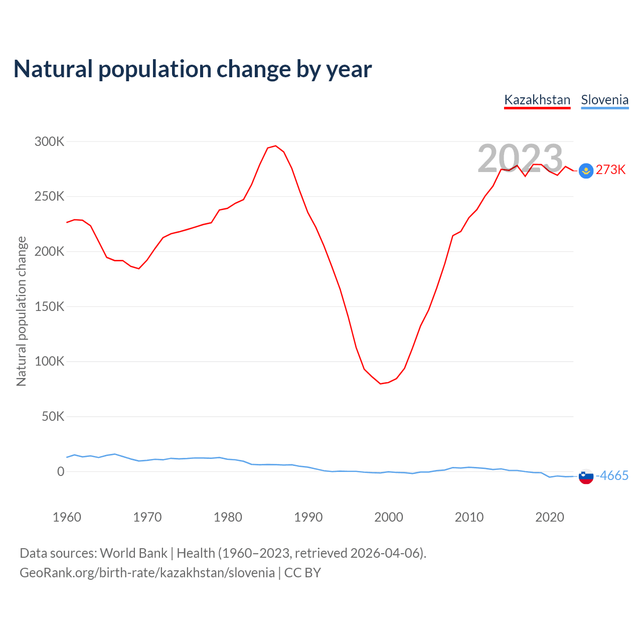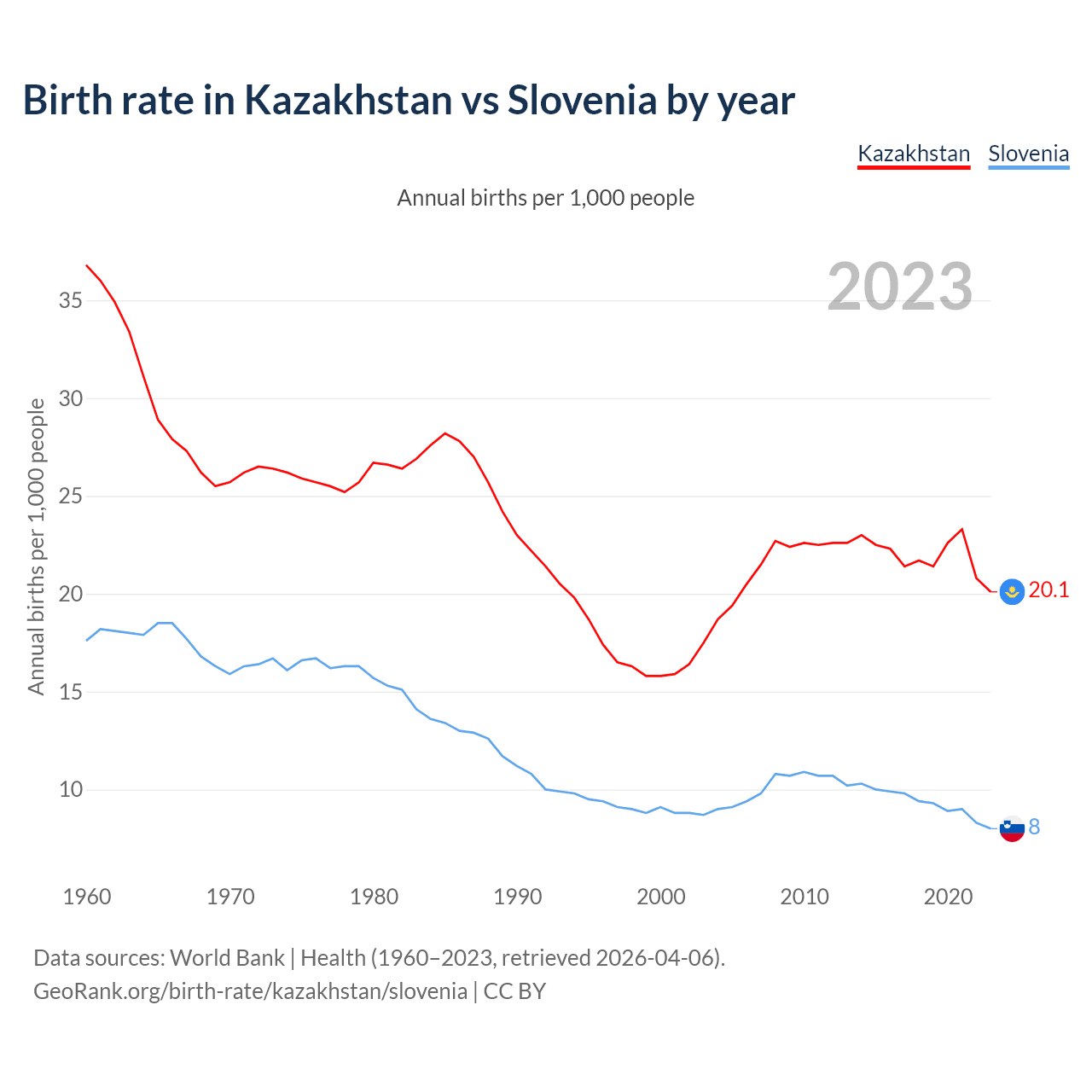 Kazakhstan has an annual birth rate of 20.1 births per 1,000 people, compared to 8 for Slovenia. The average number of children a woman is expected to have during her lifetime — the fertility rate, is 3.01 in Kazakhstan and 1.51 in Slovenia — 49.9% difference.
