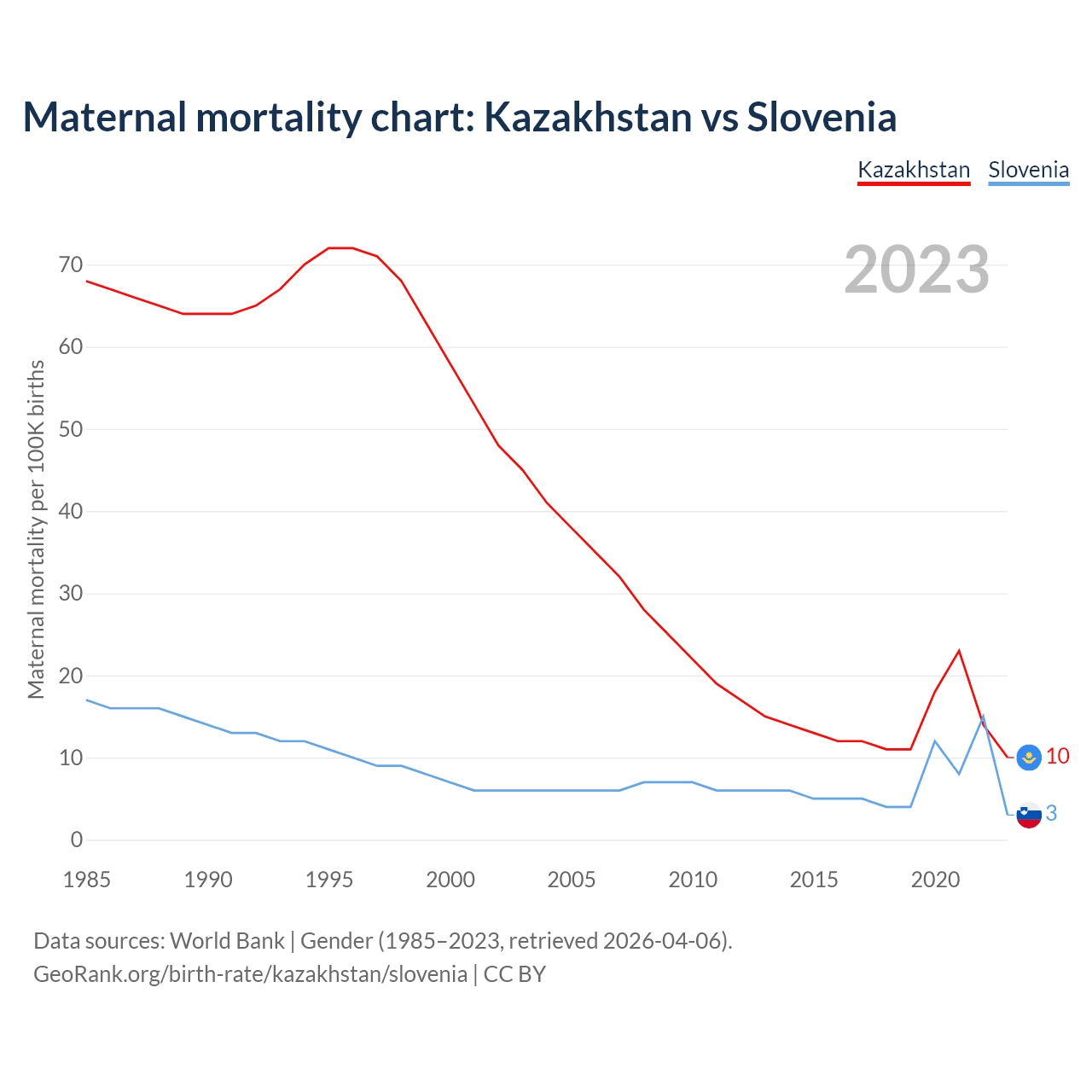 The maternal mortality rate, which is the probability of dying during childbirth or within 42 days of pregnancy termination, is 10 deaths per 100,000 live births in Kazakhstan, compared to 3 deaths in Slovenia.