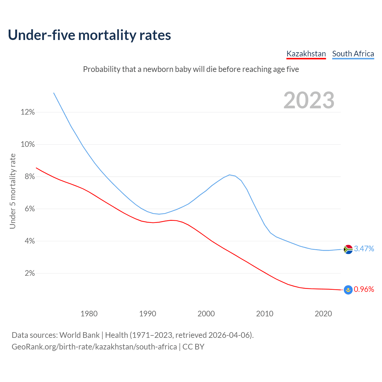 The chance that a newborn baby will die before reaching age five is 0.96% in Kazakhstan and 3.47% in South Africa. Above is a chart with historical data on under-five mortality rates.