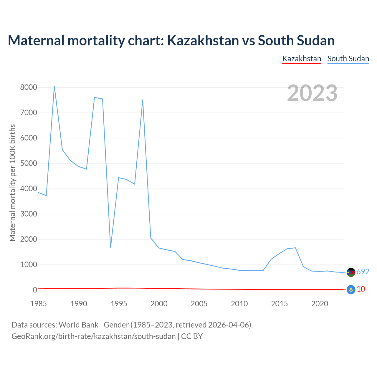 The maternal mortality rate, which is the probability of dying during childbirth or within 42 days of pregnancy termination, is 10 deaths per 100,000 live births in Kazakhstan, compared to 692 deaths in South Sudan.
