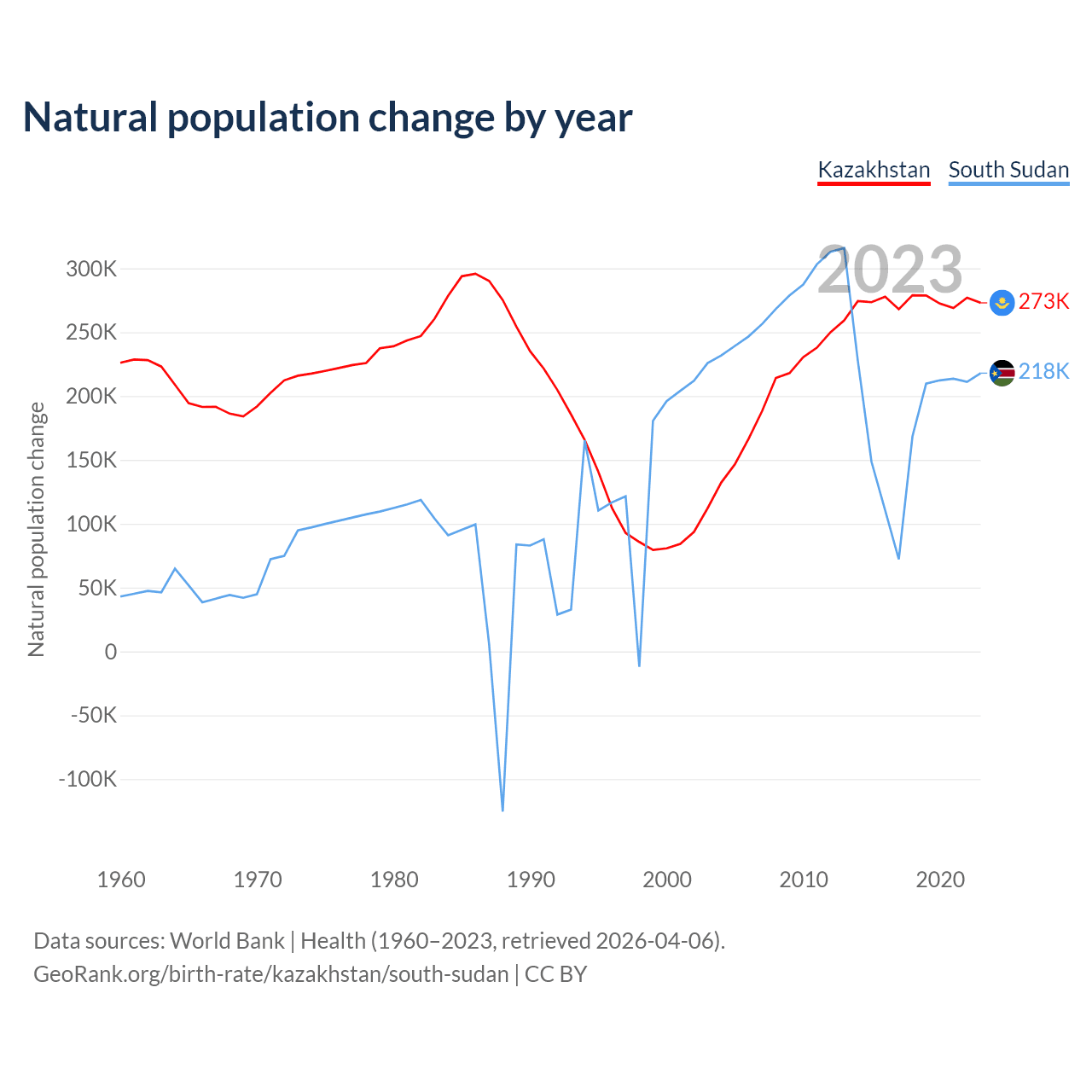 Kazakhstan has an annual birth rate of 20.1 births per 1,000 people, compared to 28.6 for South Sudan. The average number of children a woman is expected to have during her lifetime — the fertility rate, is 3.01 in Kazakhstan and 3.86 in South Sudan — 28.3% difference.