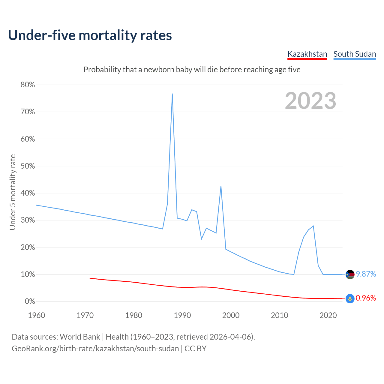 The chance that a newborn baby will die before reaching age five is 0.96% in Kazakhstan and 9.87% in South Sudan. Above is a chart with historical data on under-five mortality rates.