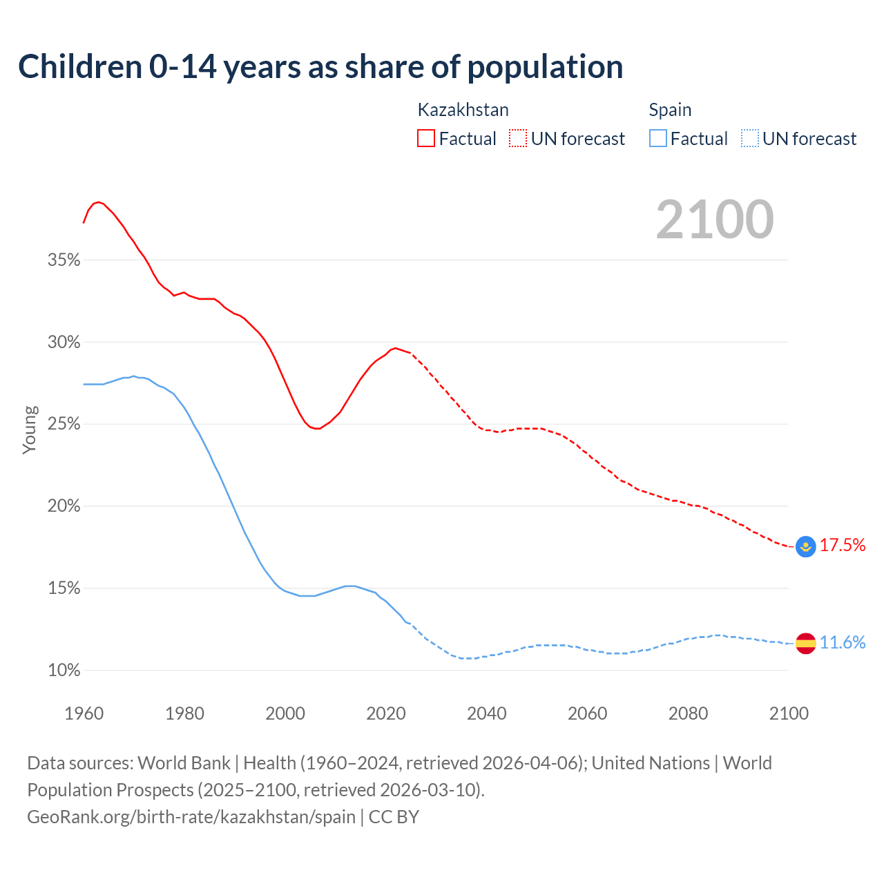 Kazakhstan has an annual birth rate of 20.1 births per 1,000 people, compared to 6.7 for Spain. The average number of children a woman is expected to have during her lifetime — the fertility rate, is 3.01 in Kazakhstan and 1.12 in Spain — 62.8% difference.