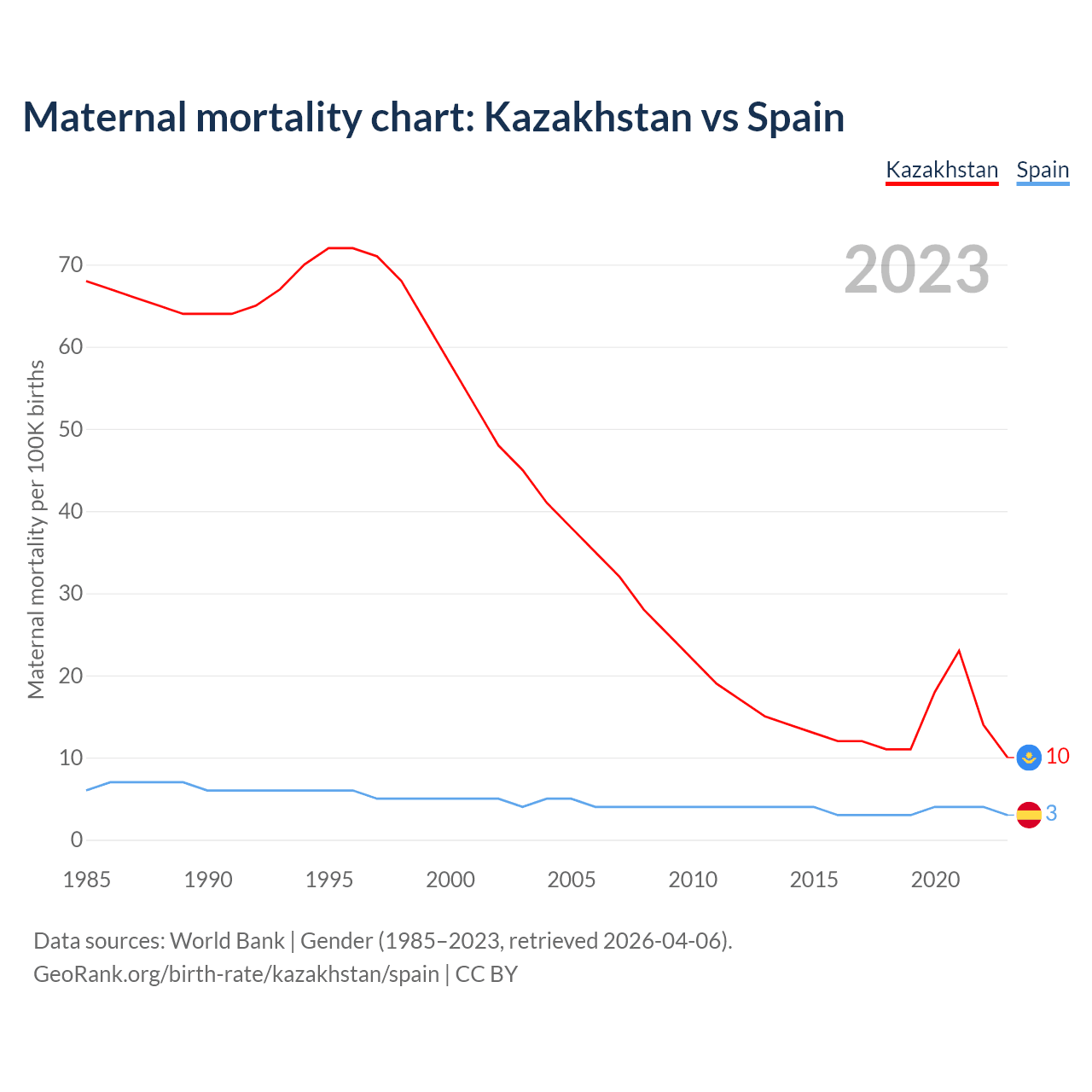 The maternal mortality rate, which is the probability of dying during childbirth or within 42 days of pregnancy termination, is 10 deaths per 100,000 live births in Kazakhstan, compared to 3 deaths in Spain.