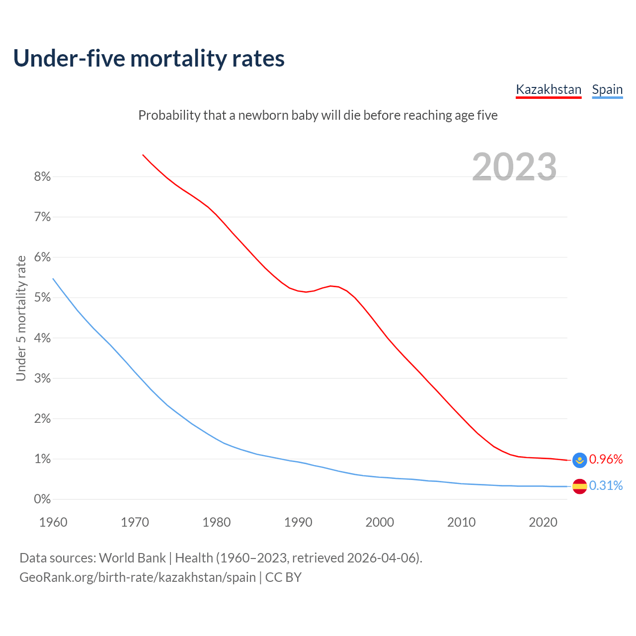 The chance that a newborn baby will die before reaching age five is 0.96% in Kazakhstan and 0.31% in Spain. Above is a chart with historical data on under-five mortality rates.