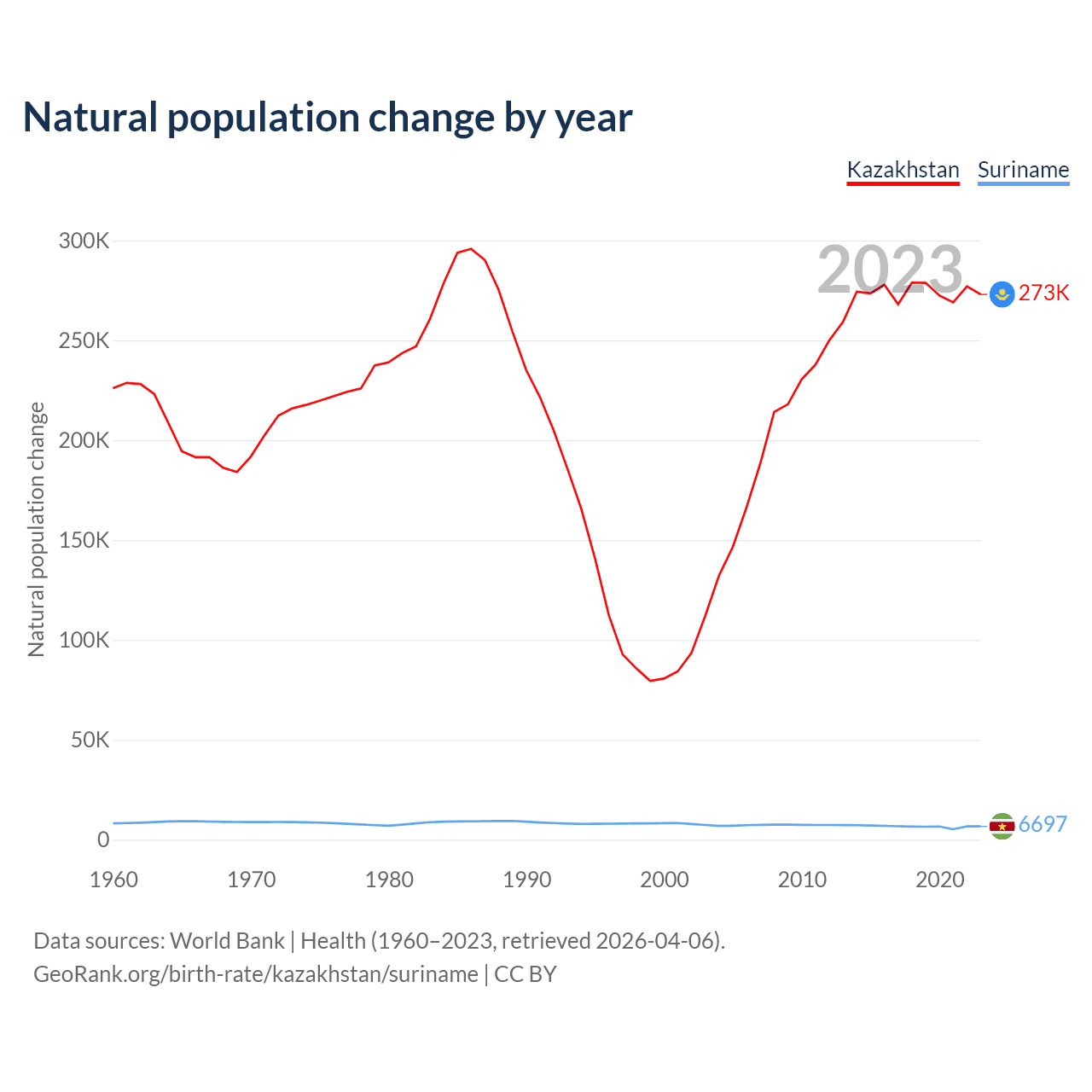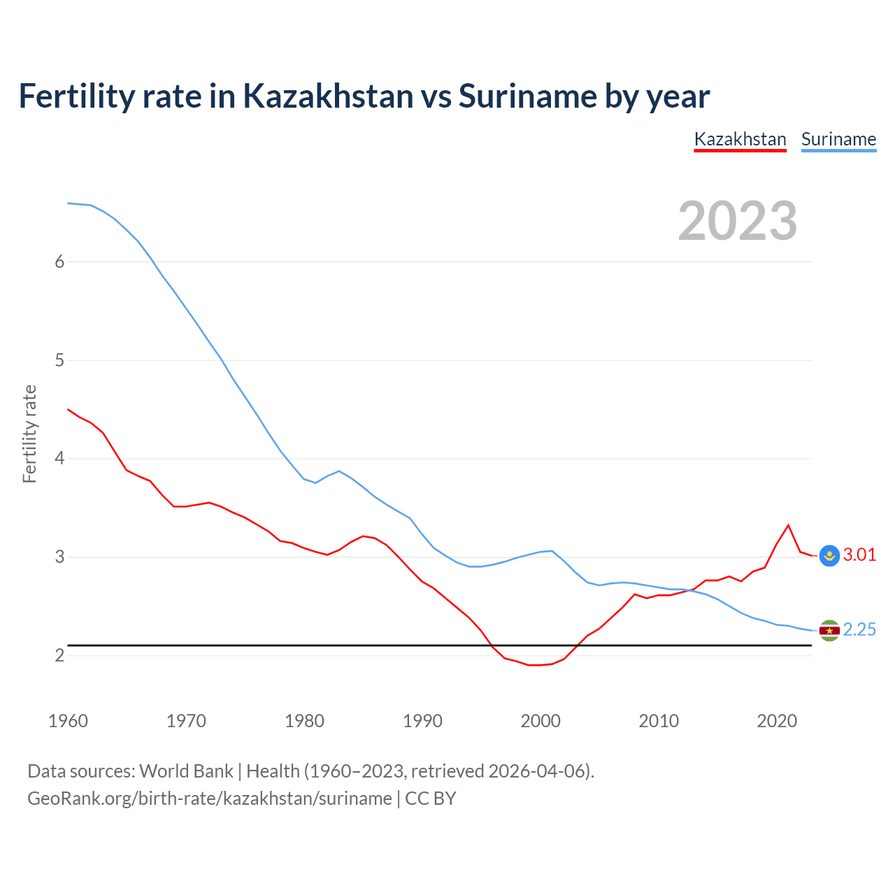 According to the latest available data on birth rates, the fertility rate in Kazakhstan was 3.01 children per woman in 2023, compared to 2.25 in Suriname in 2023. The replacement level is considered to be 2.1 children per woman.