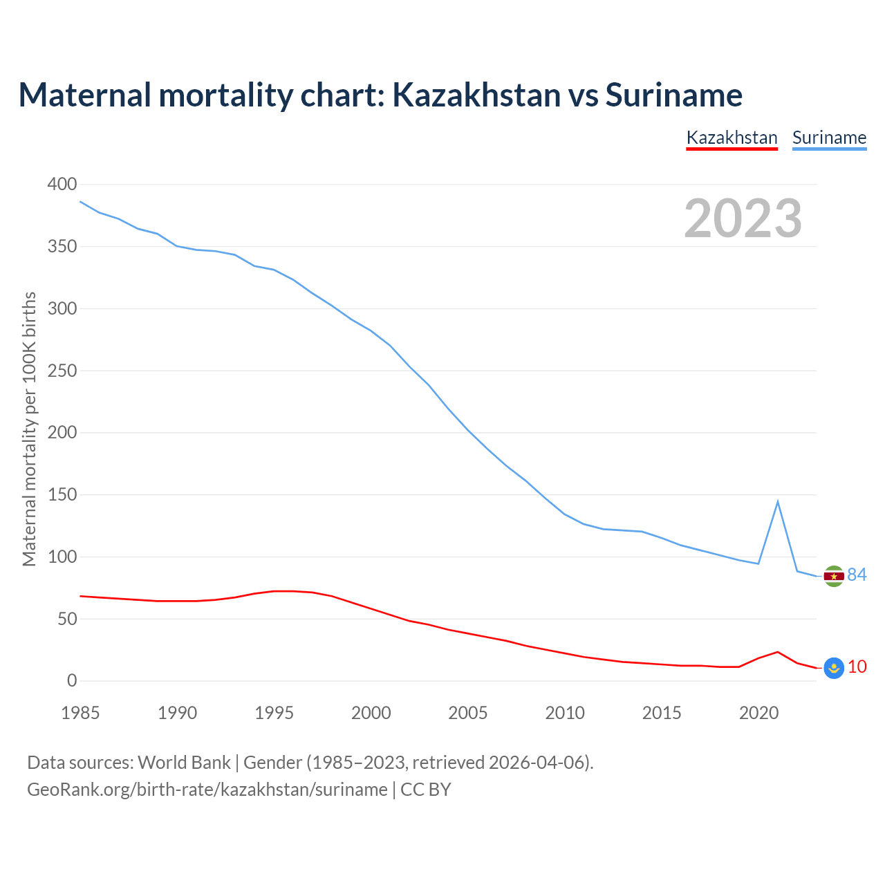 The maternal mortality rate, which is the probability of dying during childbirth or within 42 days of pregnancy termination, is 10 deaths per 100,000 live births in Kazakhstan, compared to 84 deaths in Suriname.