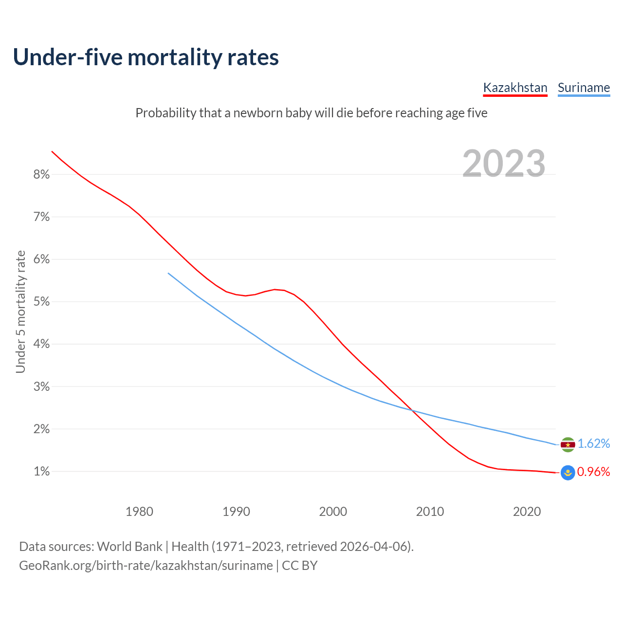 The chance that a newborn baby will die before reaching age five is 0.96% in Kazakhstan and 1.62% in Suriname. Above is a chart with historical data on under-five mortality rates.