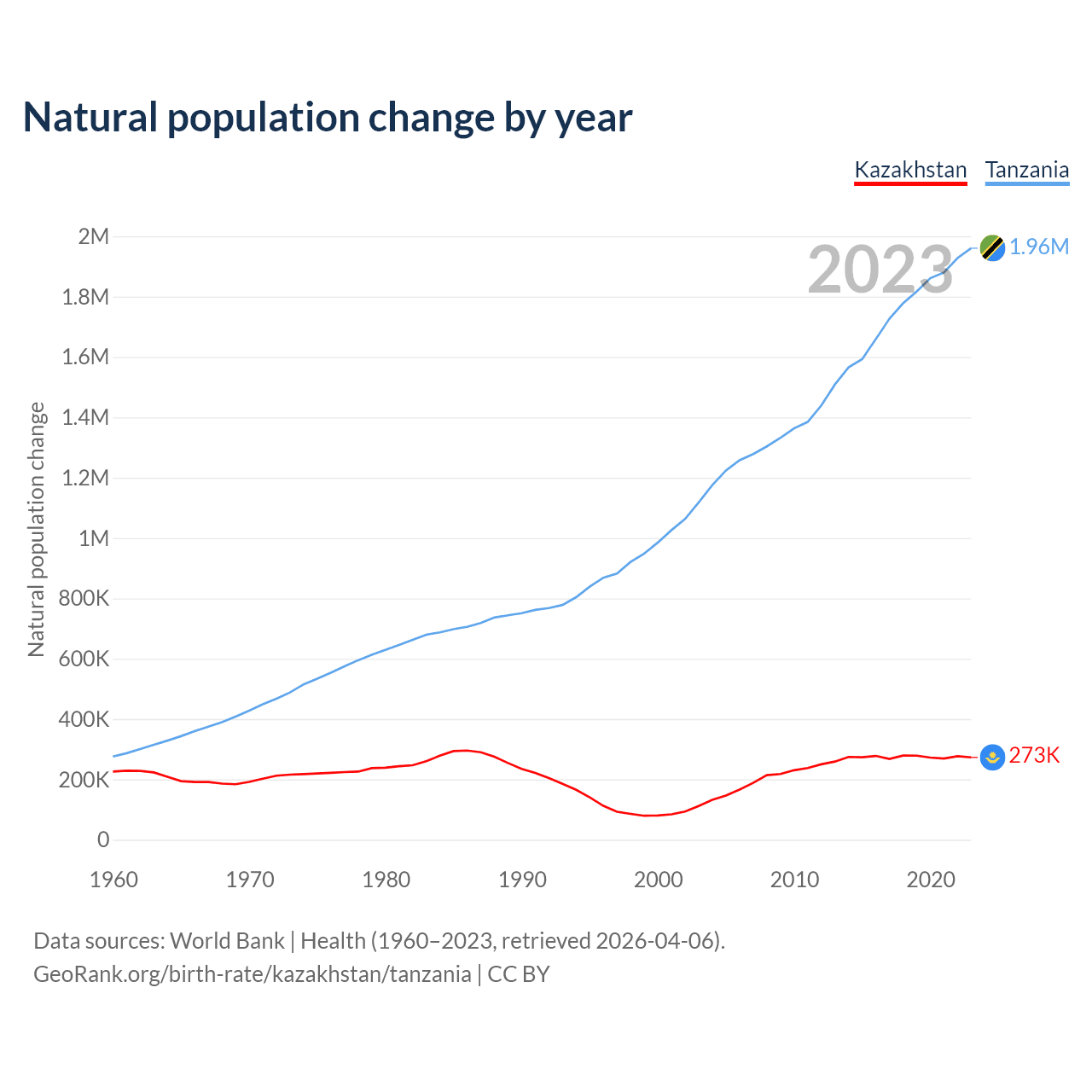 According to the latest available data on birth rates, the fertility rate in Kazakhstan was 3.01 children per woman in 2023, compared to 4.61 in Tanzania in 2023. The replacement level is considered to be 2.1 children per woman.