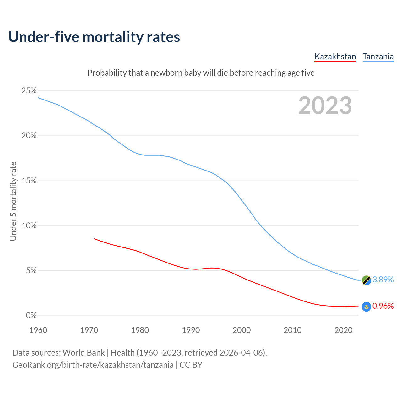 The chance that a newborn baby will die before reaching age five is 0.96% in Kazakhstan and 3.89% in Tanzania. Above is a chart with historical data on under-five mortality rates.
