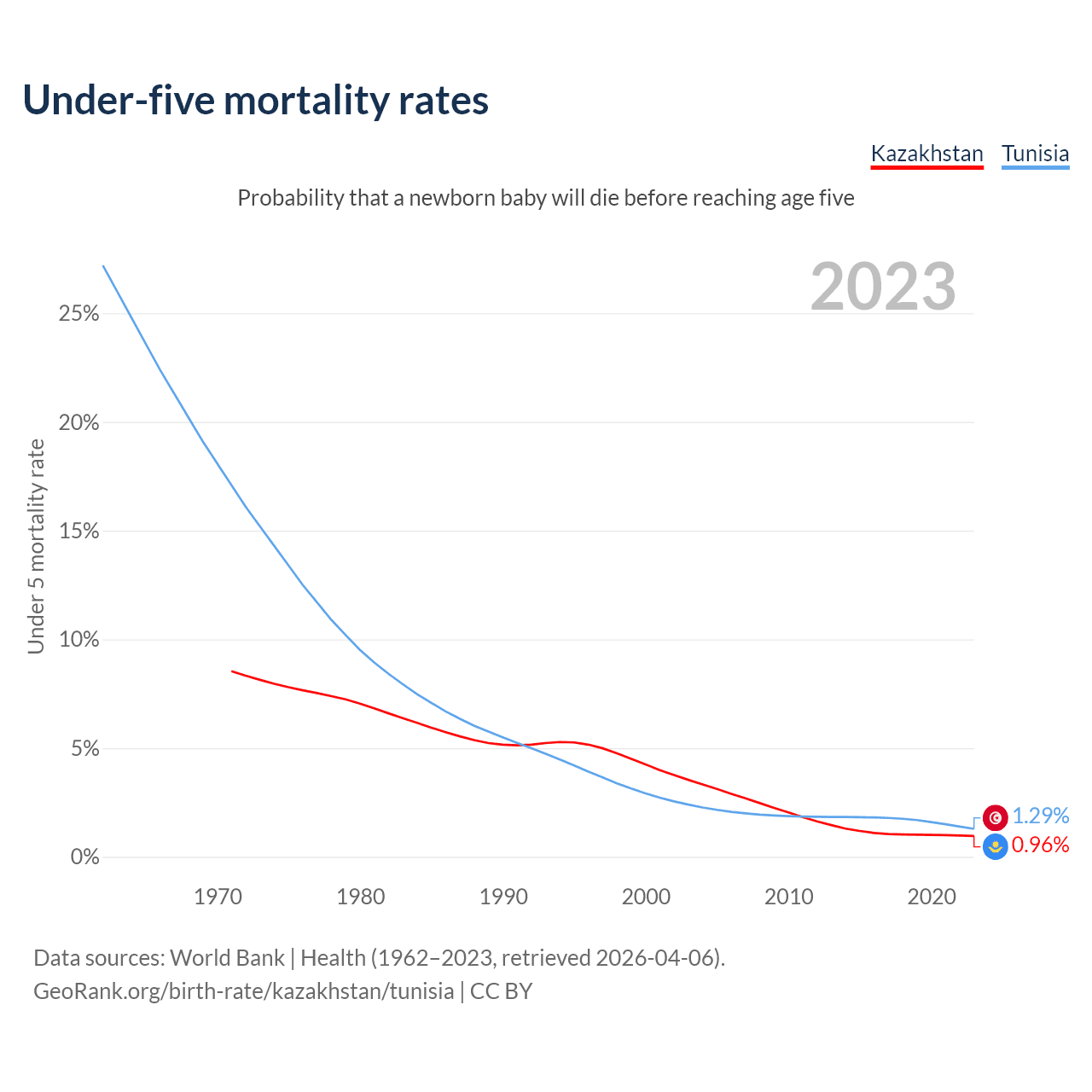 The chance that a newborn baby will die before reaching age five is 0.96% in Kazakhstan and 1.29% in Tunisia. Above is a chart with historical data on under-five mortality rates.