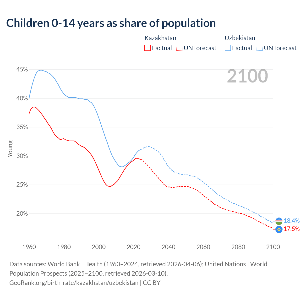 According to the latest available data on birth rates, the fertility rate in Kazakhstan was 3.01 children per woman in 2023, compared to 3.5 in Uzbekistan in 2023. The replacement level is considered to be 2.1 children per woman.