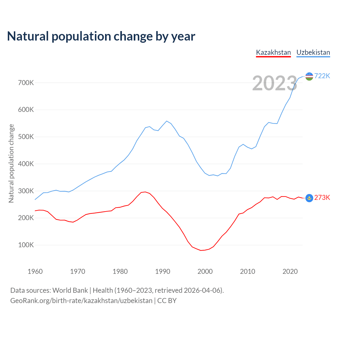 Kazakhstan has an annual birth rate of 20.1 births per 1,000 people, compared to 26.5 for Uzbekistan. The average number of children a woman is expected to have during her lifetime — the fertility rate, is 3.01 in Kazakhstan and 3.5 in Uzbekistan — 16.2% difference.