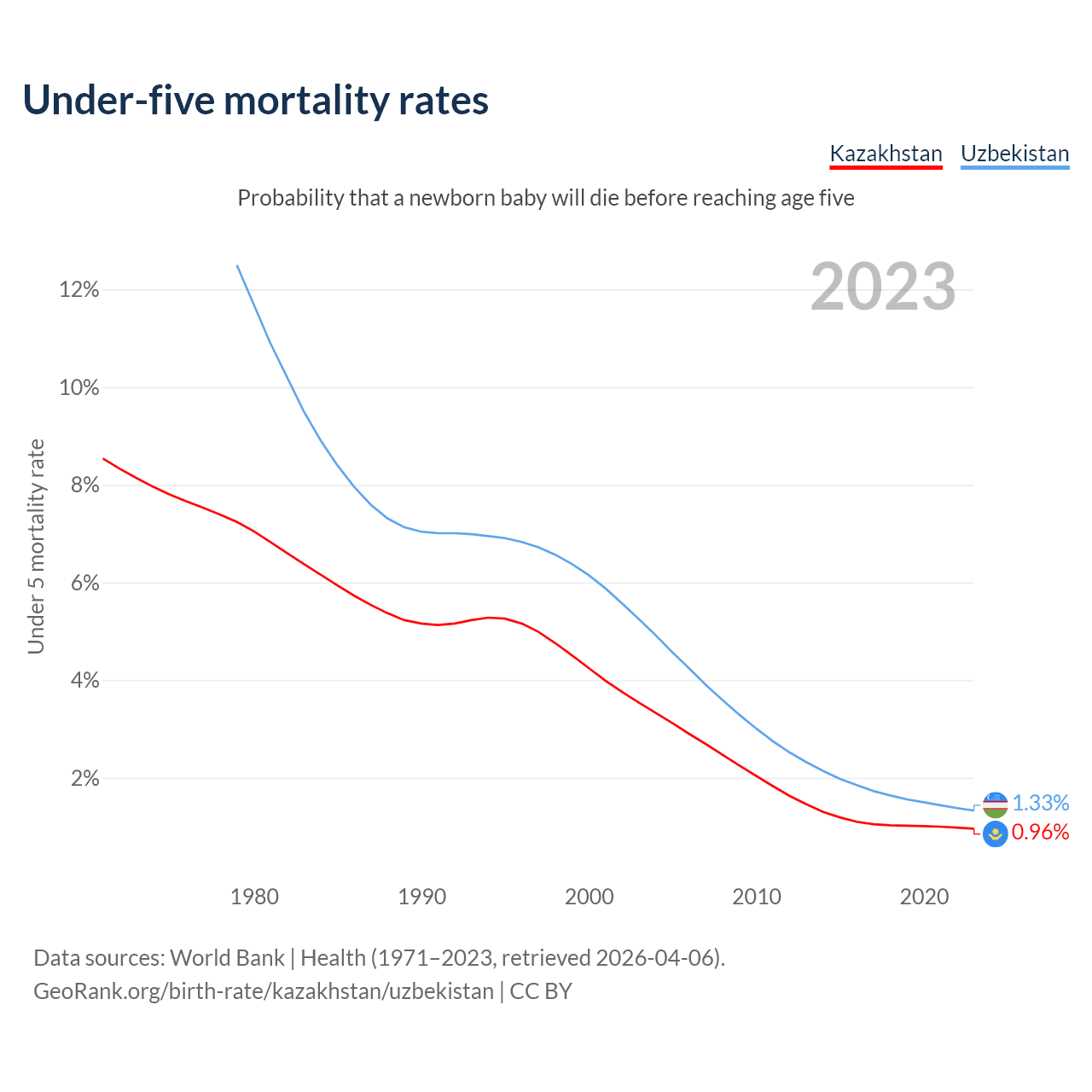 The chance that a newborn baby will die before reaching age five is 0.96% in Kazakhstan and 1.33% in Uzbekistan. Above is a chart with historical data on under-five mortality rates.