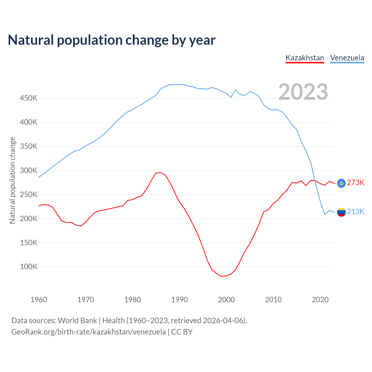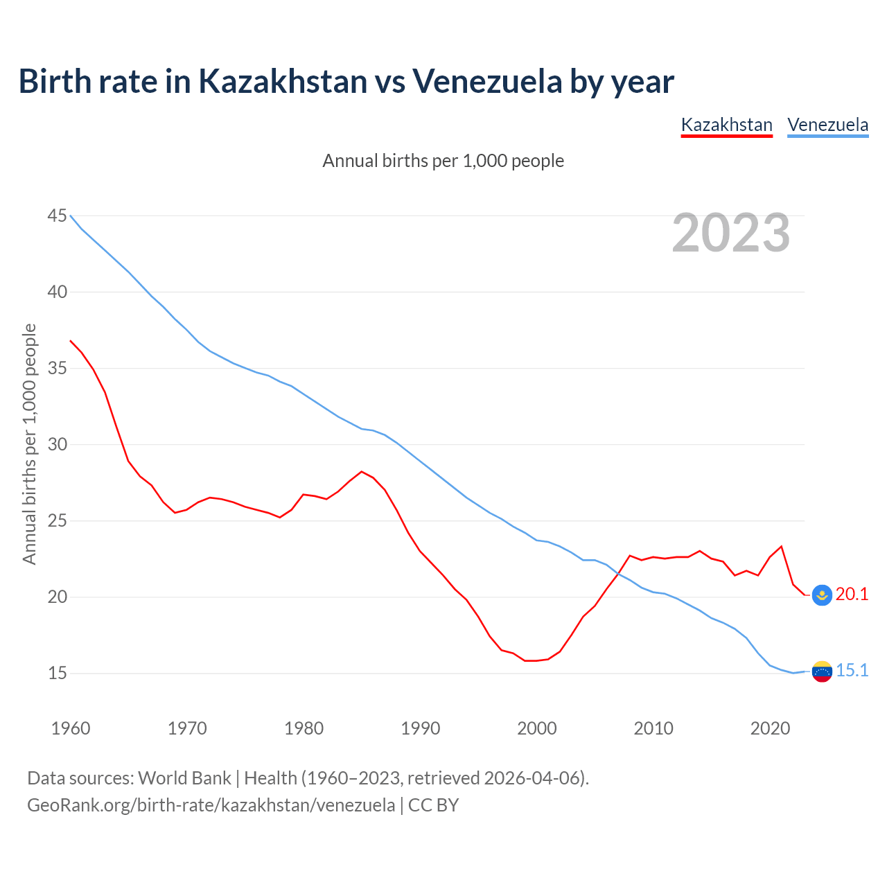 According to the latest available data on birth rates, the fertility rate in Kazakhstan was 3.01 children per woman in 2023, compared to 2.08 in Venezuela in 2023. The replacement level is considered to be 2.1 children per woman.