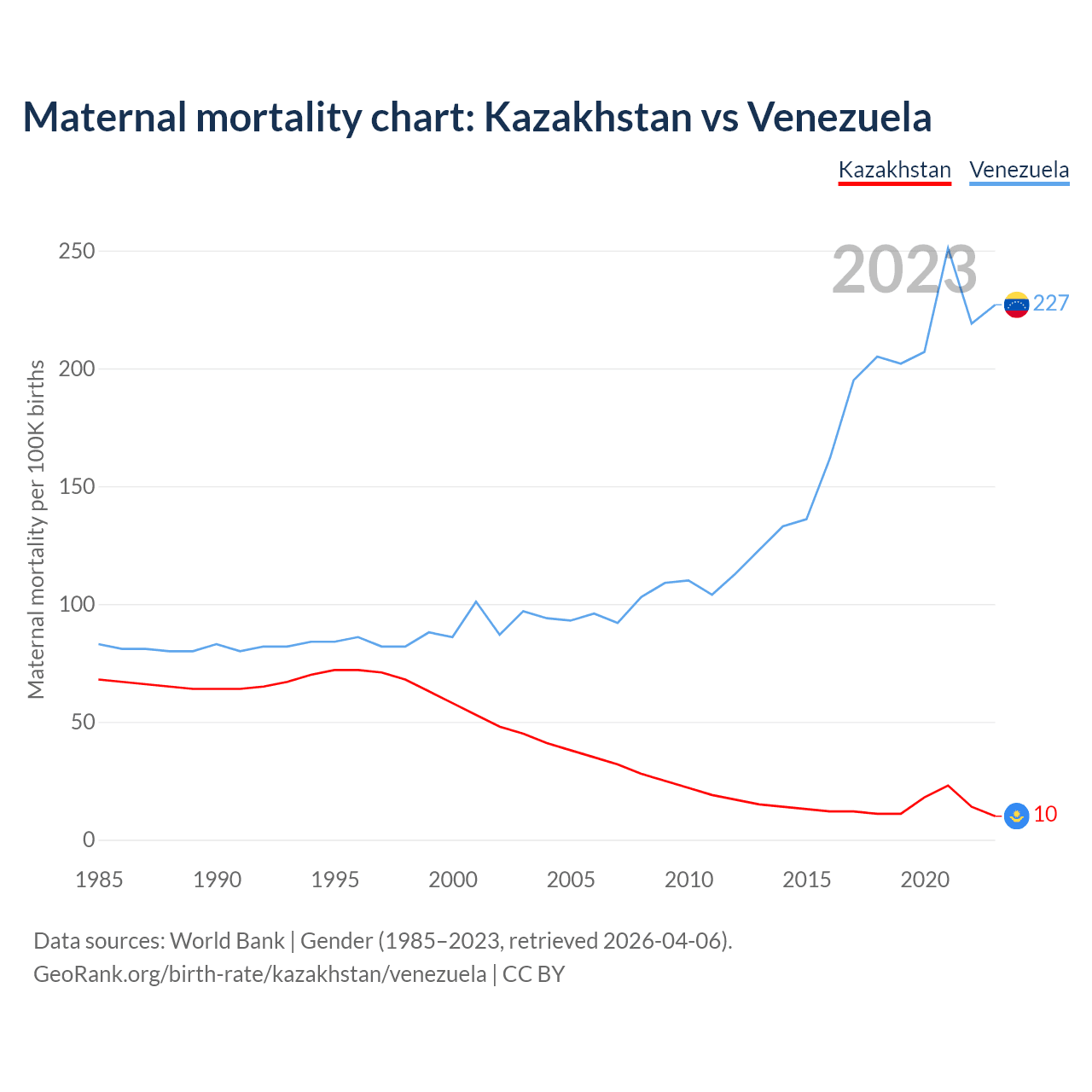 The maternal mortality rate, which is the probability of dying during childbirth or within 42 days of pregnancy termination, is 10 deaths per 100,000 live births in Kazakhstan, compared to 227 deaths in Venezuela.