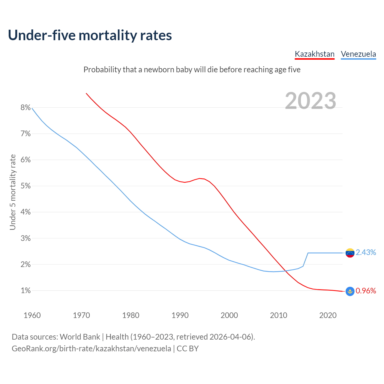 The chance that a newborn baby will die before reaching age five is 0.96% in Kazakhstan and 2.43% in Venezuela. Above is a chart with historical data on under-five mortality rates.
