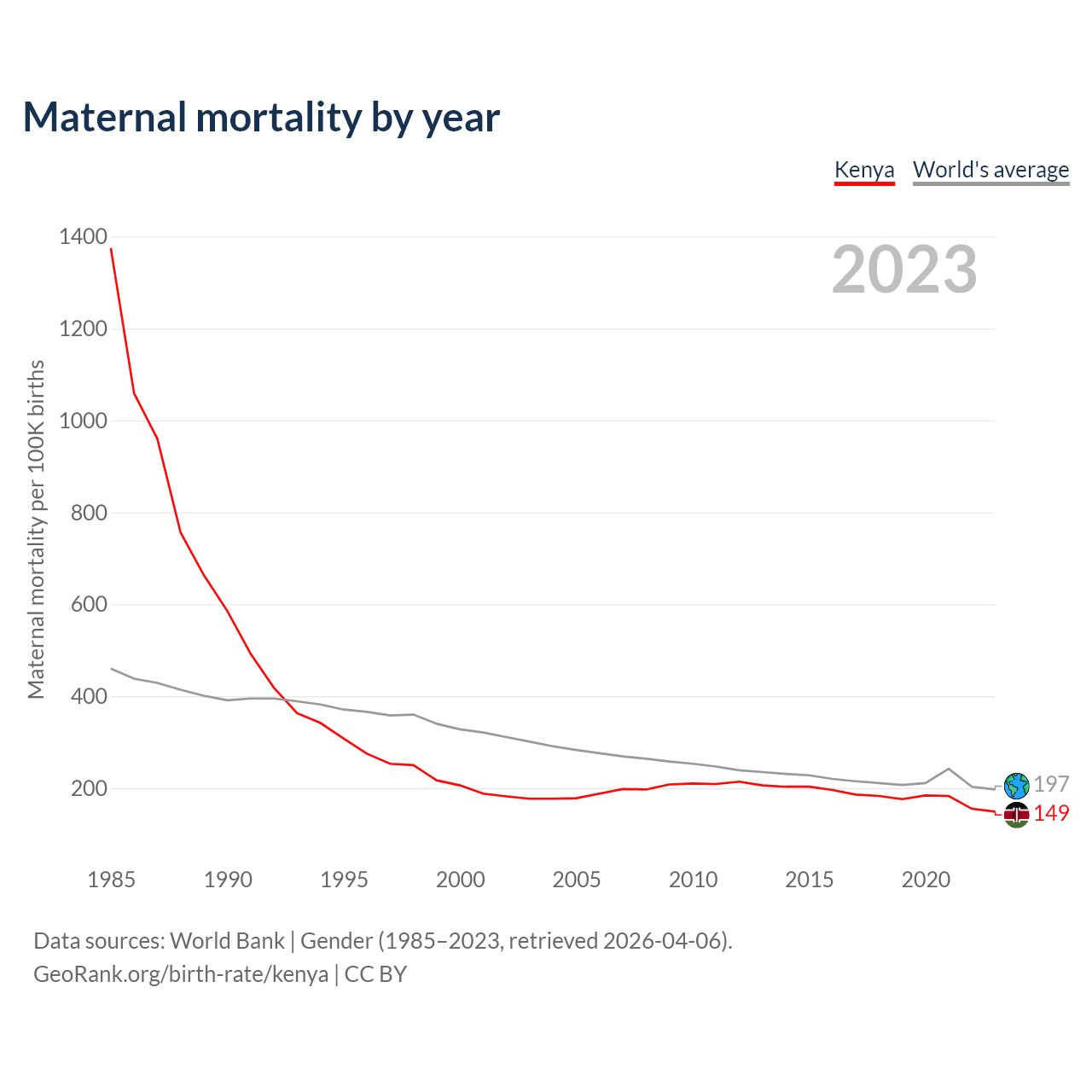 The maternal mortality rate in Kenya was 149 deaths per 100,000 live births in 2023 — a 0.15% chance of dying during childbirth or within 42 days of pregnancy termination. This is a 27.7% decrease compared to the year 2000.