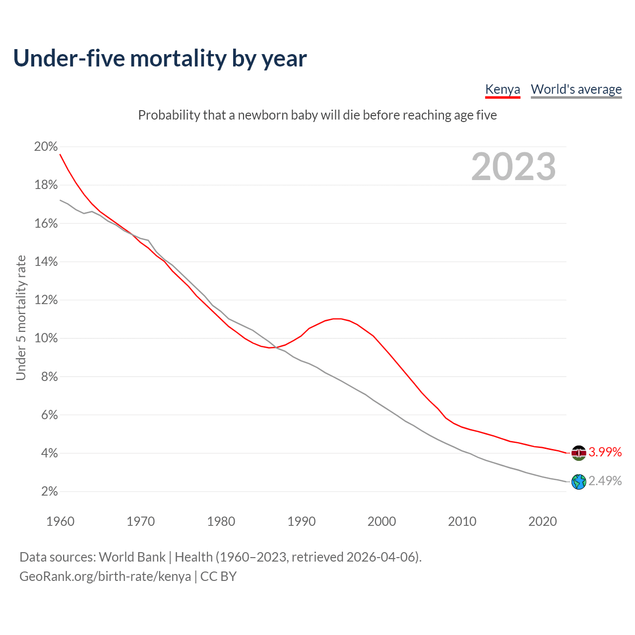 The under-5 mortality rate in Kenya was 39.9 deaths per 1,000 live births in 2023 — a 3.99% chance that a newborn baby will die before reaching age five. This is down from 96.3 deaths per 1,000 live births in 2000.
