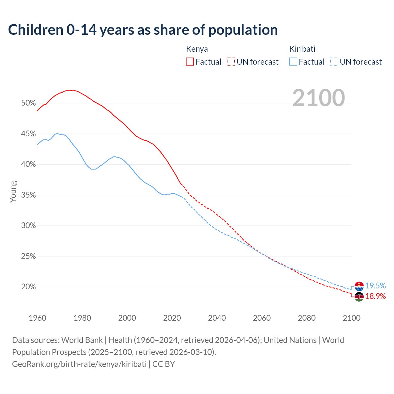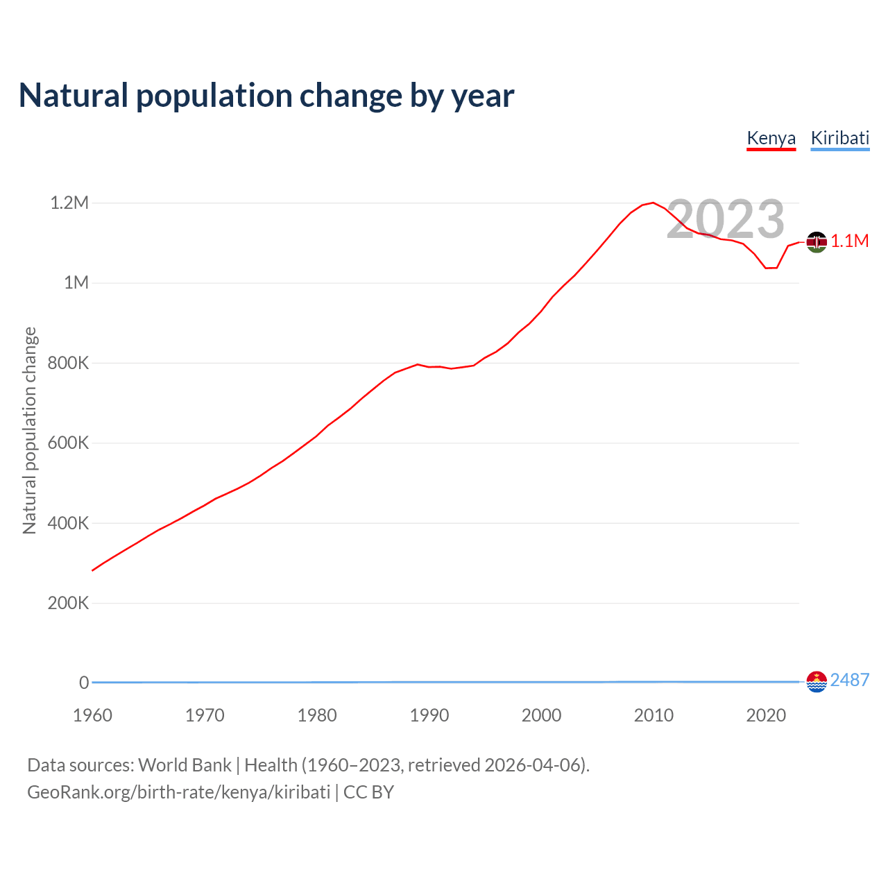 According to the latest available data on birth rates, the fertility rate in Kenya was 3.21 children per woman in 2023, compared to 3.15 in Kiribati in 2023. The replacement level is considered to be 2.1 children per woman.