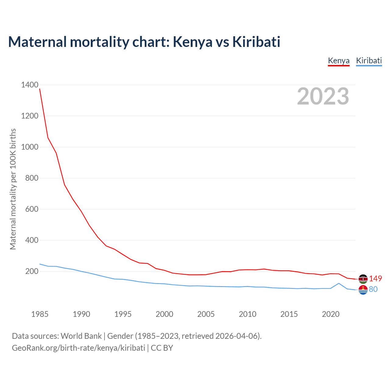 The maternal mortality rate, which is the probability of dying during childbirth or within 42 days of pregnancy termination, is 149 deaths per 100,000 live births in Kenya, compared to 80 deaths in Kiribati.
